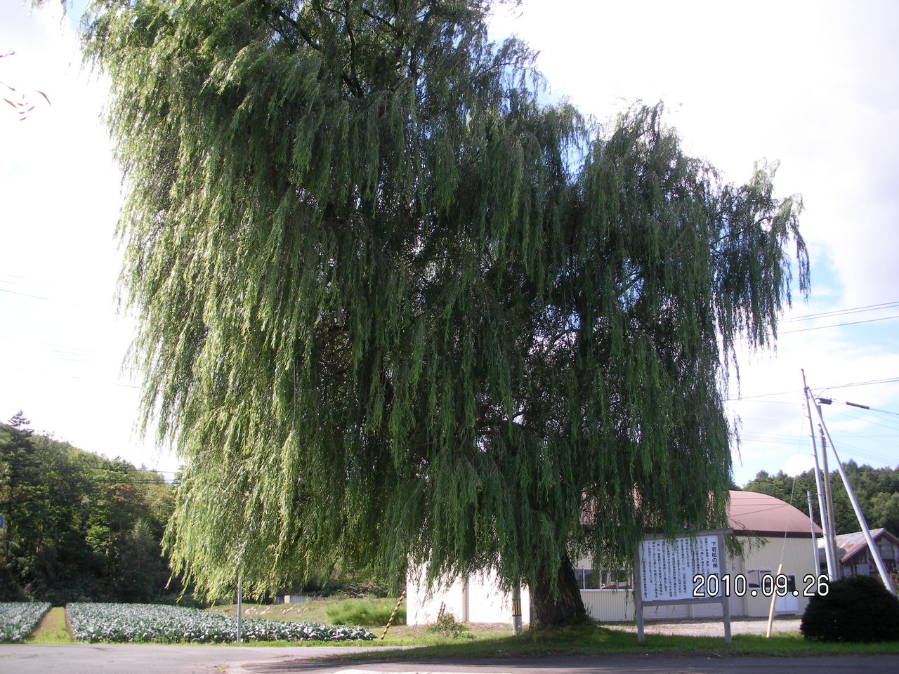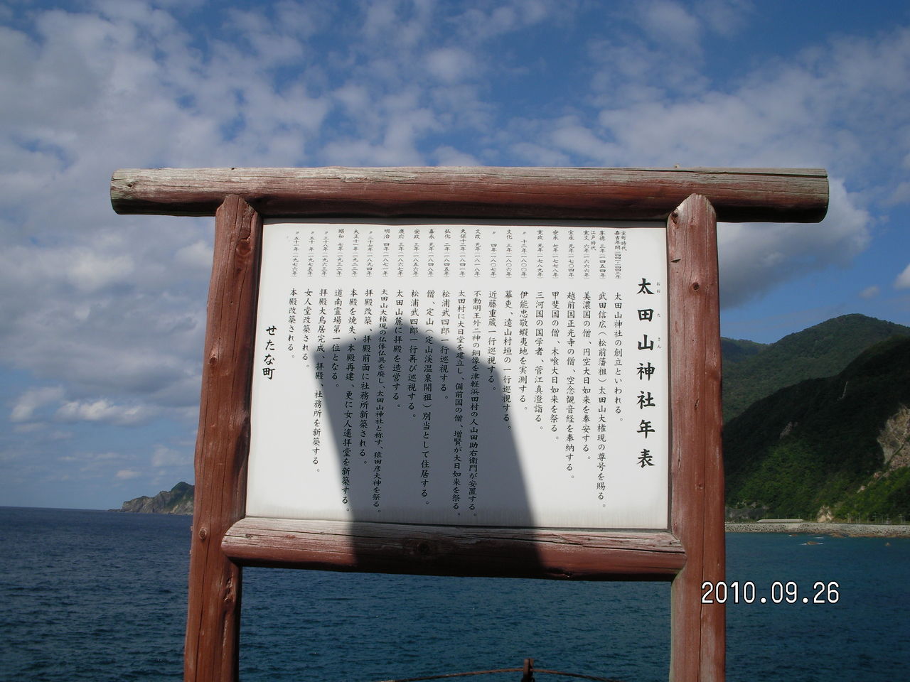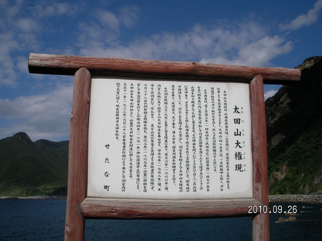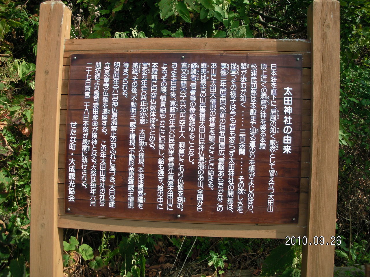 室町時代までの貴重な文化財がある。看板の後ろに池が見える。