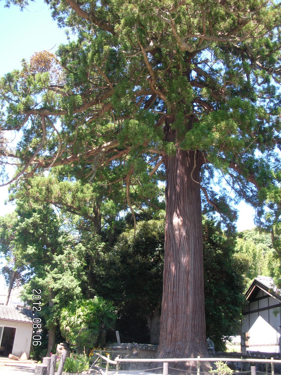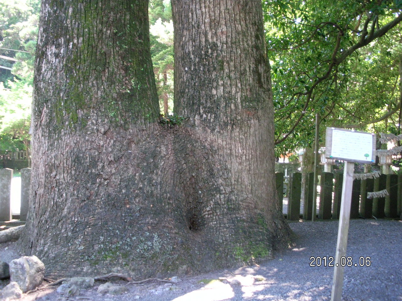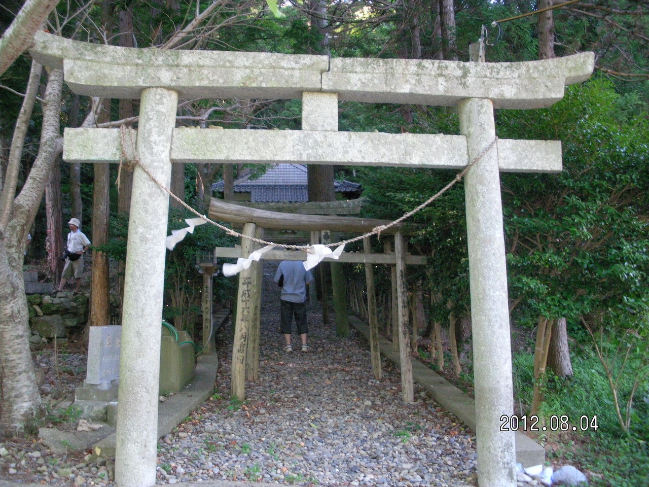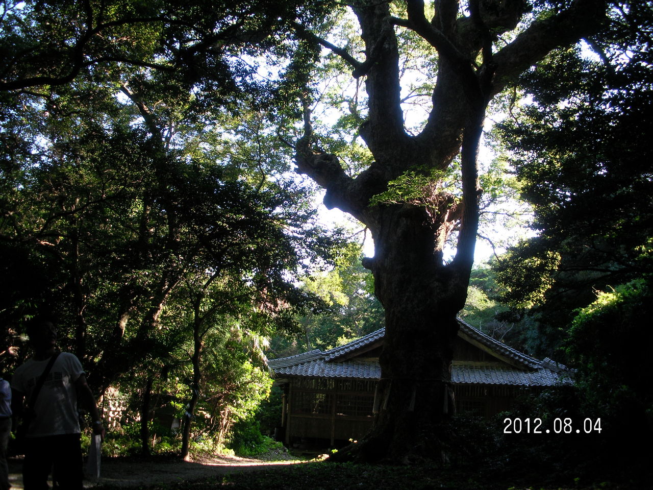 大木が生い茂る太古からの森林の中に神社が存在しする。ムッ、とするような暑い気温