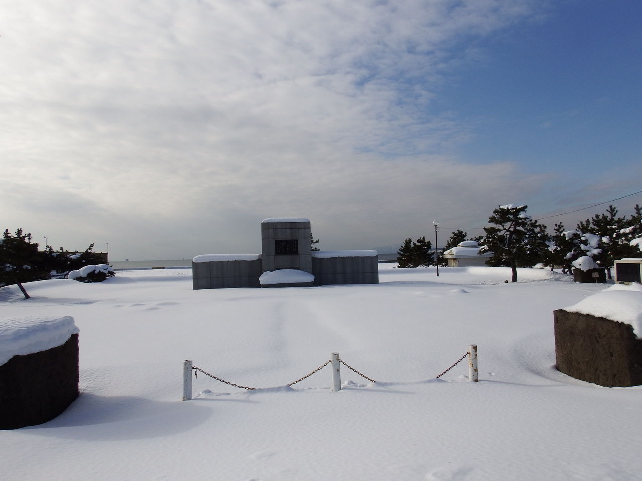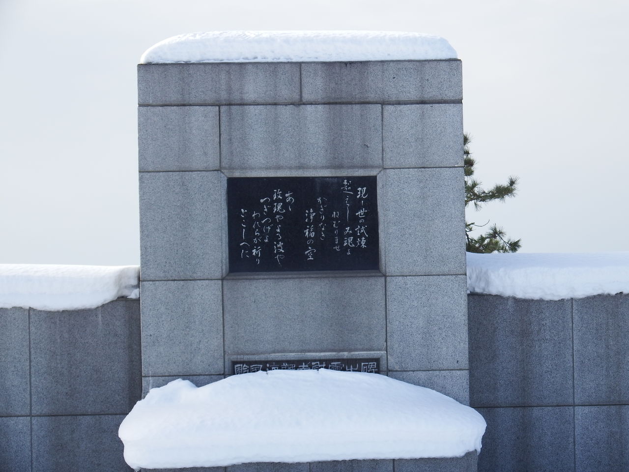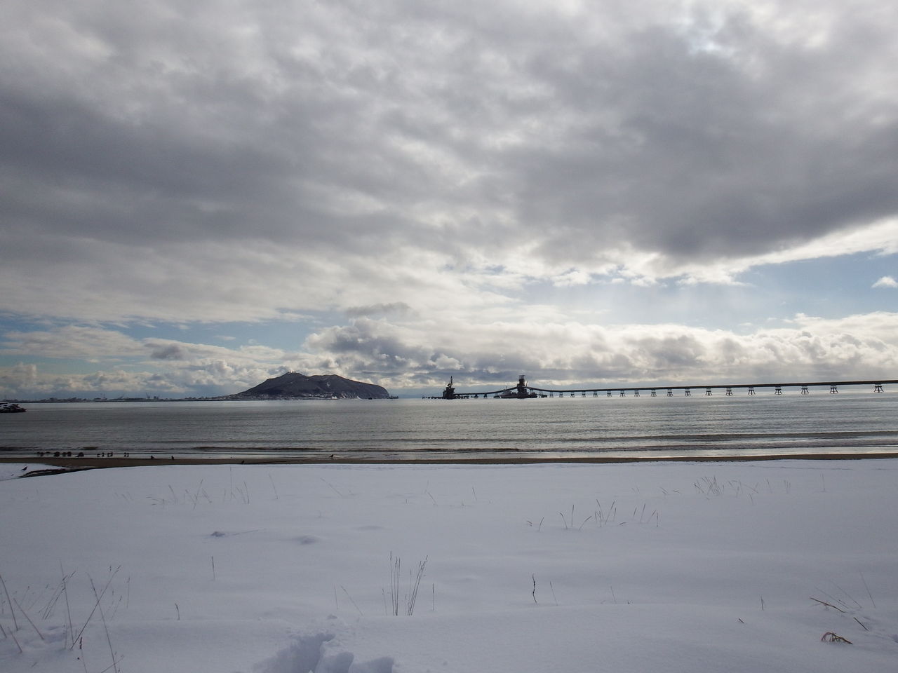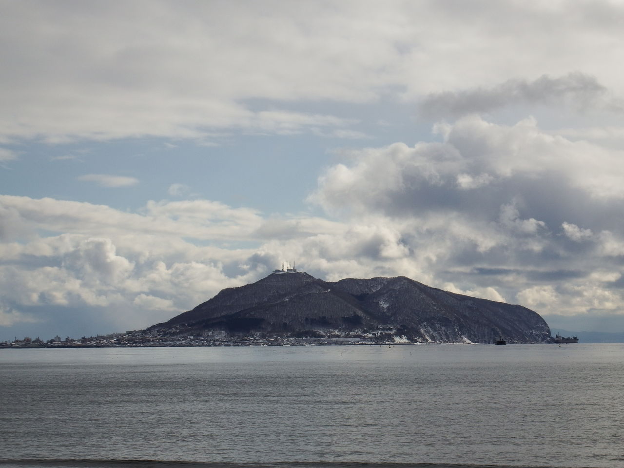 函館方面を見る。横津岳連峰の雪を頂く山々が見える。かつては、スキー場があったが