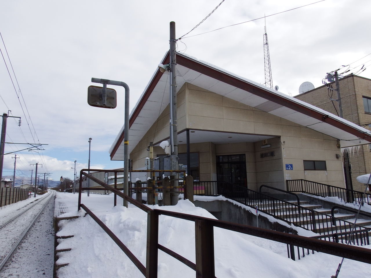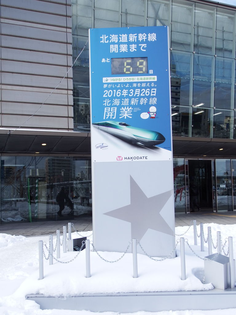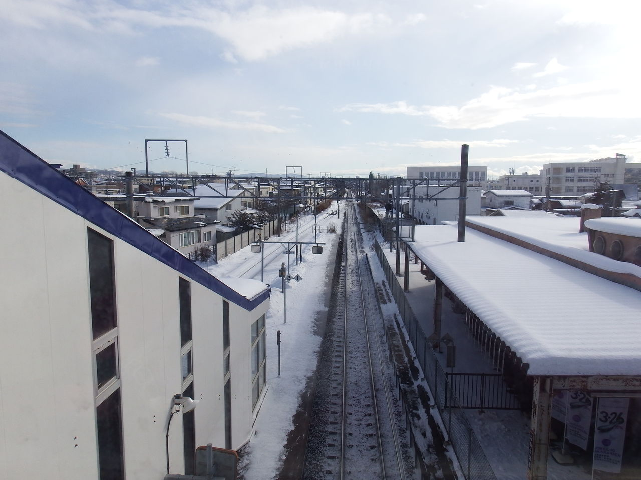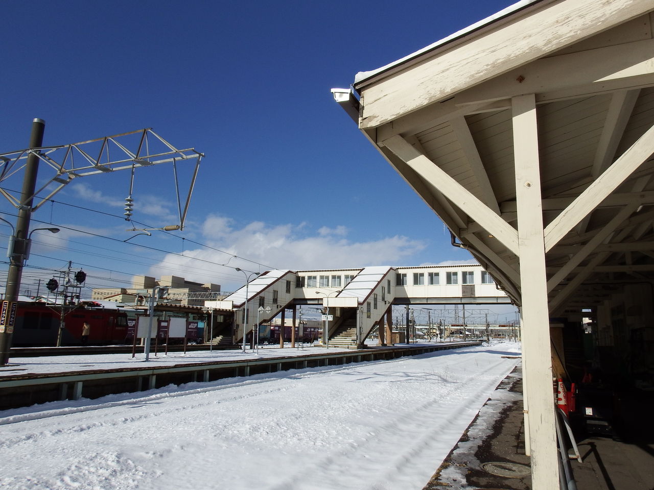 跨線橋の上の駅。あちこちに新幹線3.26開業のポスターが貼られれている。