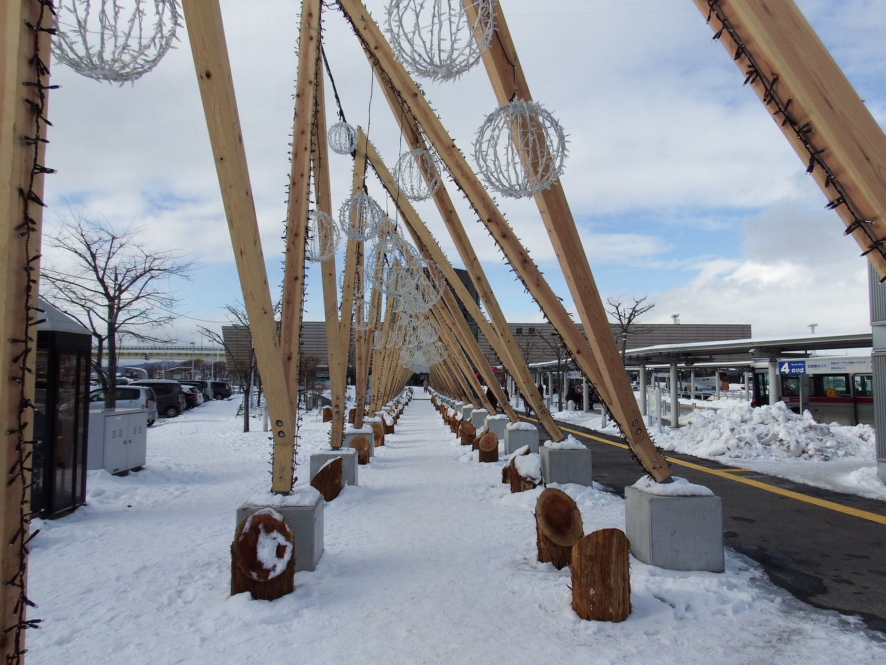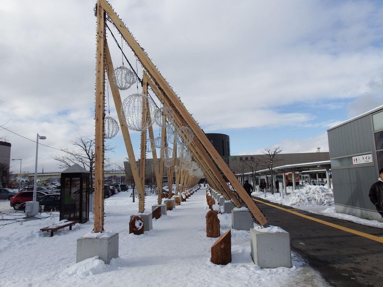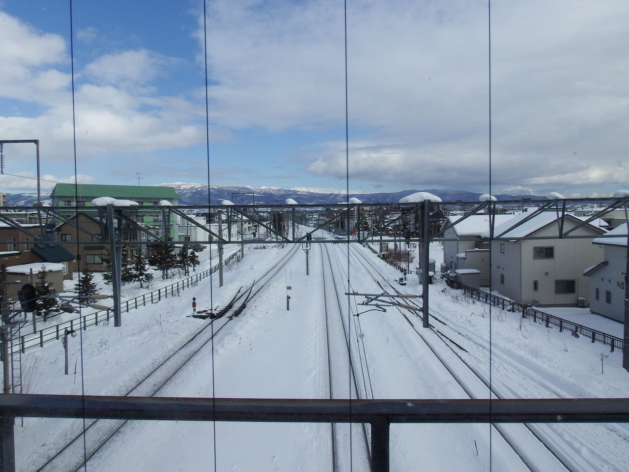 跨線橋の上の駅。あちこちに新幹線3.26開業のポスターが貼られれている。