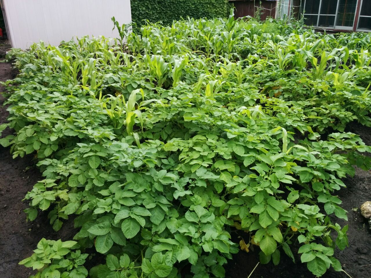 ジャガイモは男爵とメークインの2種類植え、葉が枯れてきたものから掘り出して食べて