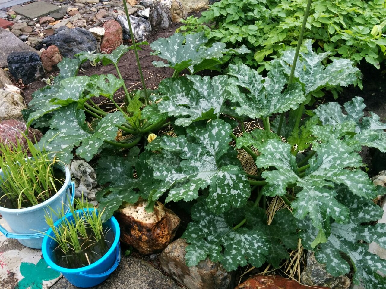 出来ました。 まずは、大きく成長したズッキーニから。 バケツと比較しても大きいことが分かりますね。近づいて見ると。 黄色い花が咲いている部分に実がなっています。昨日、その中から幾つかを採って、