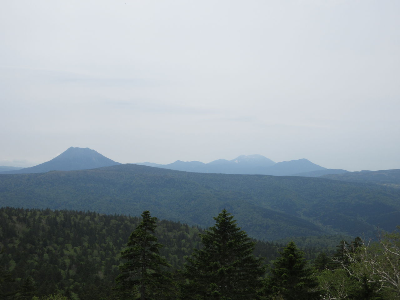 西の方向を見ると、左に雄阿寒岳(1371m)、奥に、今も噴煙を上げる雌阿寒岳(1499m)と