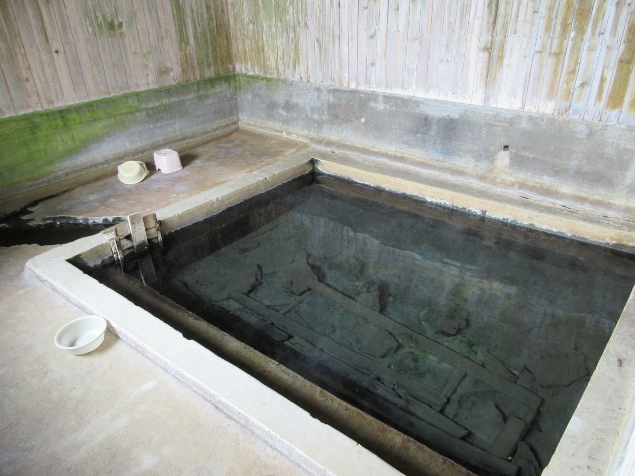 無色透明で、湯加減もピッタリ。手を入れるとちょうどいい温度で、入浴可能。
