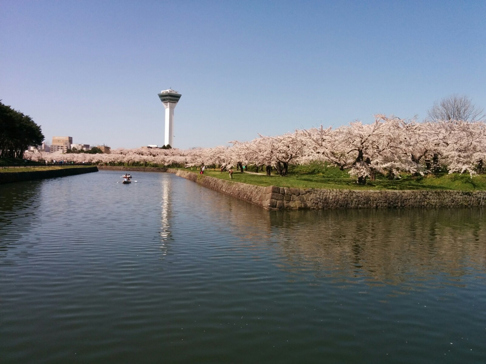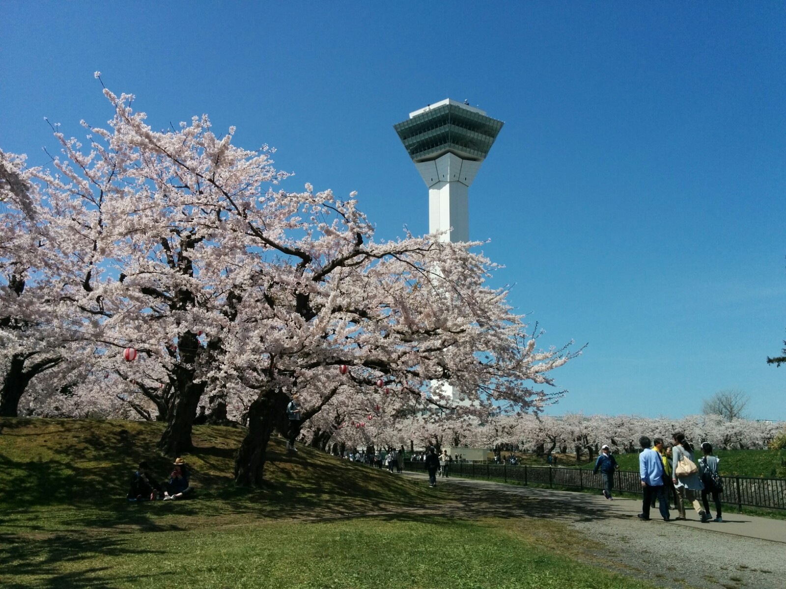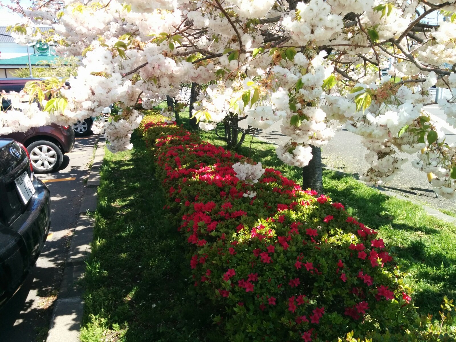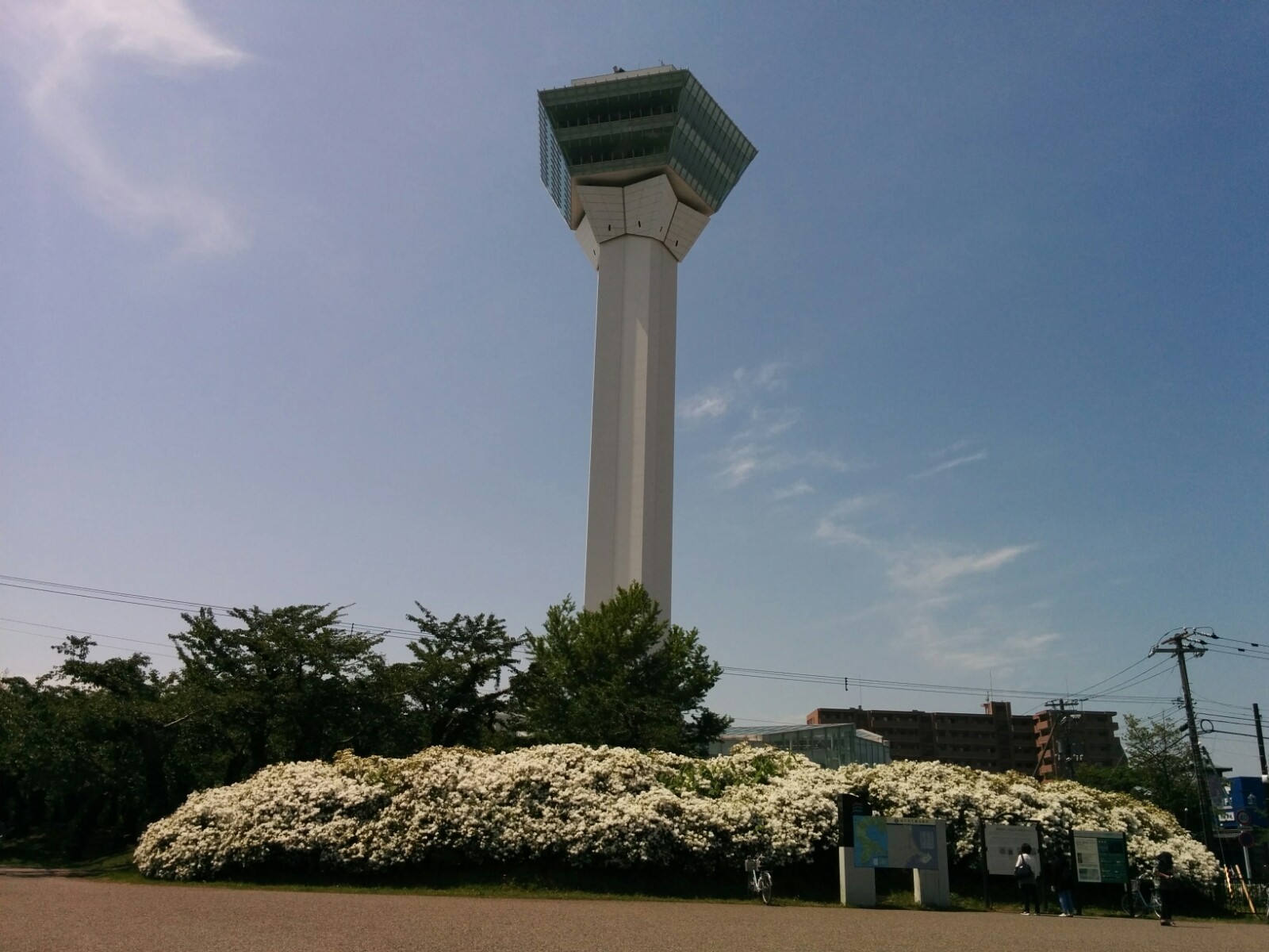 向かい側を見ると、五稜郭タワーの下にも白色のツツジが咲いています。