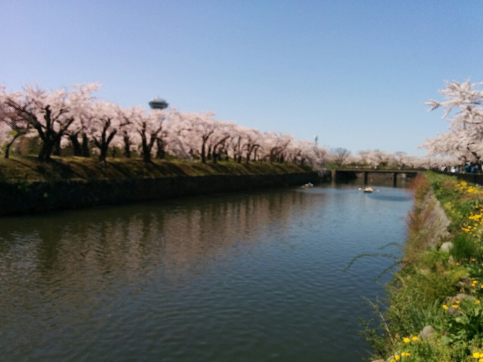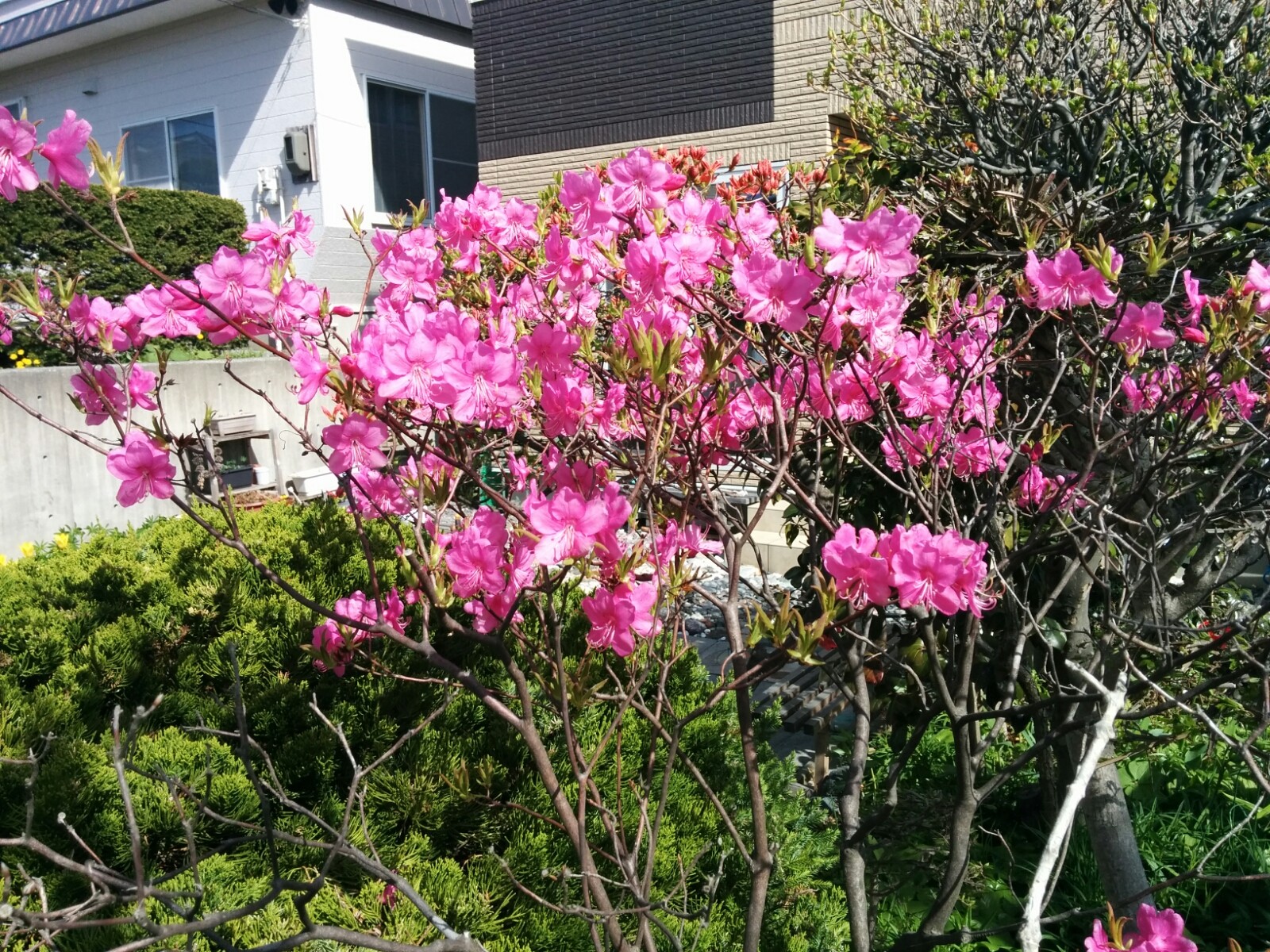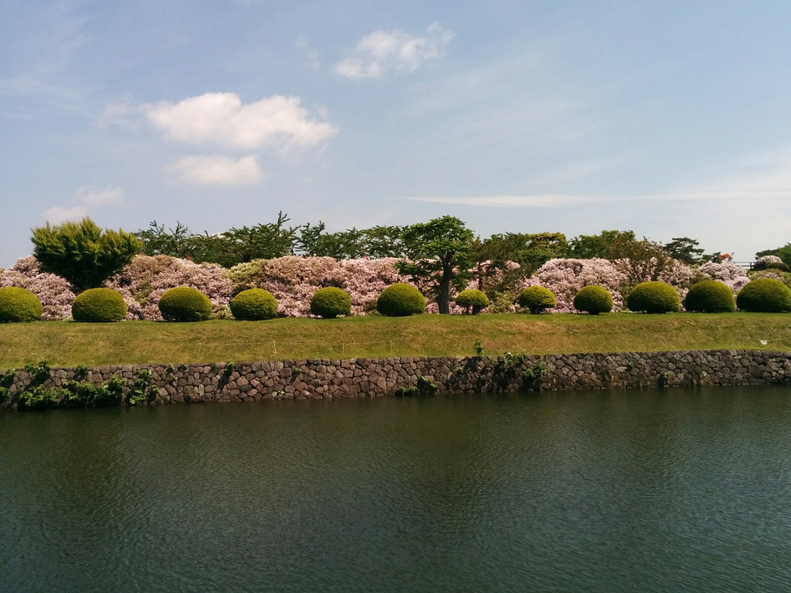 このふじ棚の下を歩いていると、気持ちが良くなります。香りの効果ですね。ツツジも満開。堀の外から写したツツジ。淡いピンク色のツツジがたくさん咲いています。