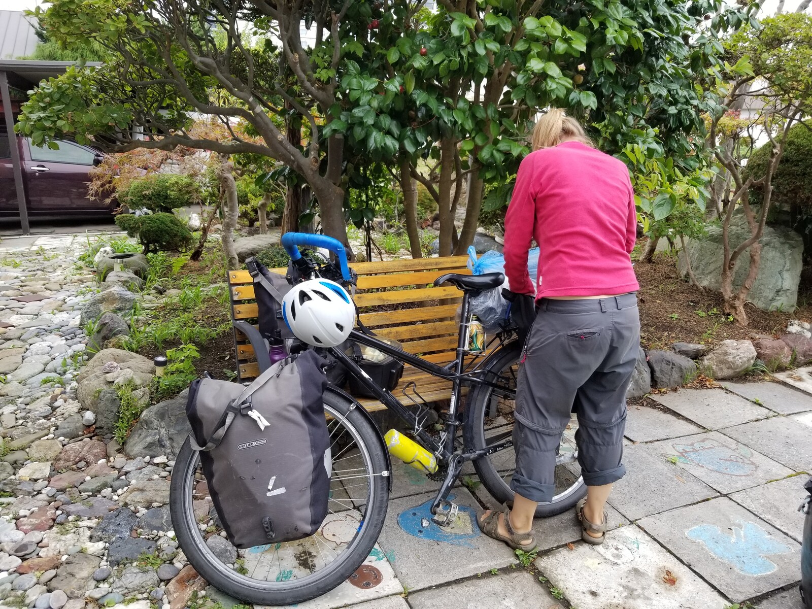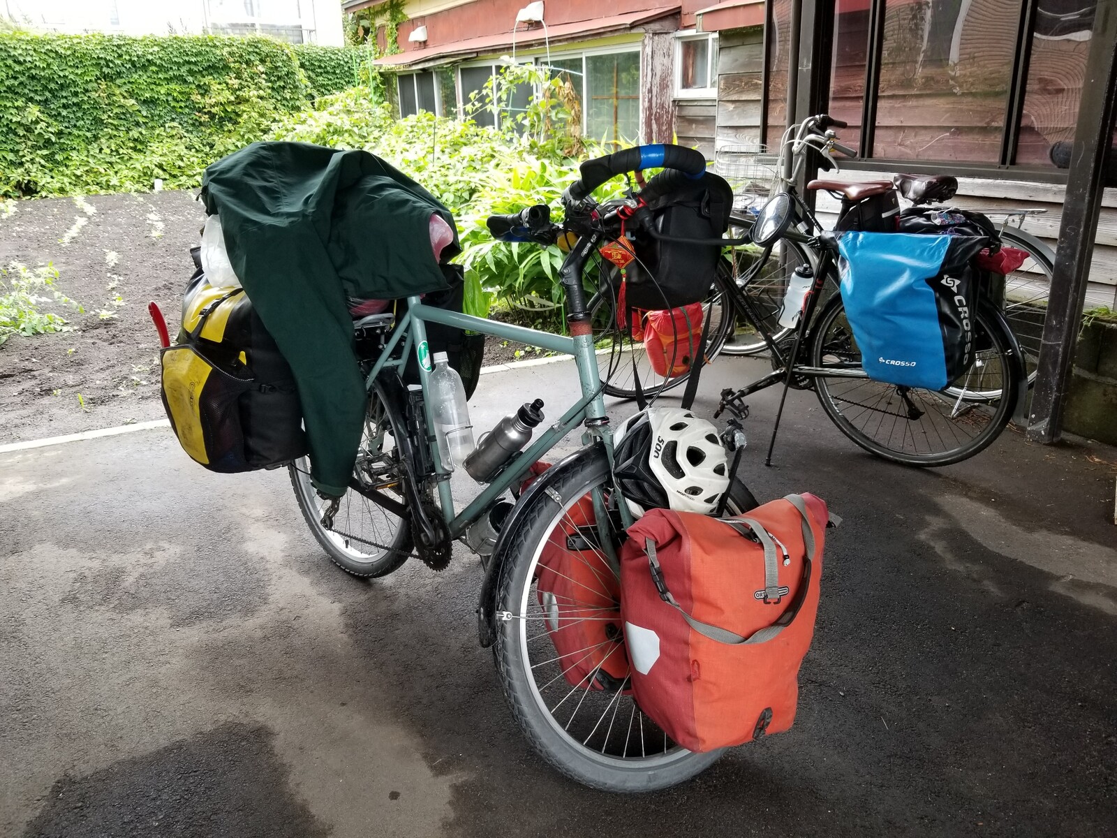 エラの自転車には前輪と後輪の両方に4個のバッグとさらに荷台に寝袋やマット。それとハンドルの下にフロントバック、合わせて40kgだそうでかなり重そう!