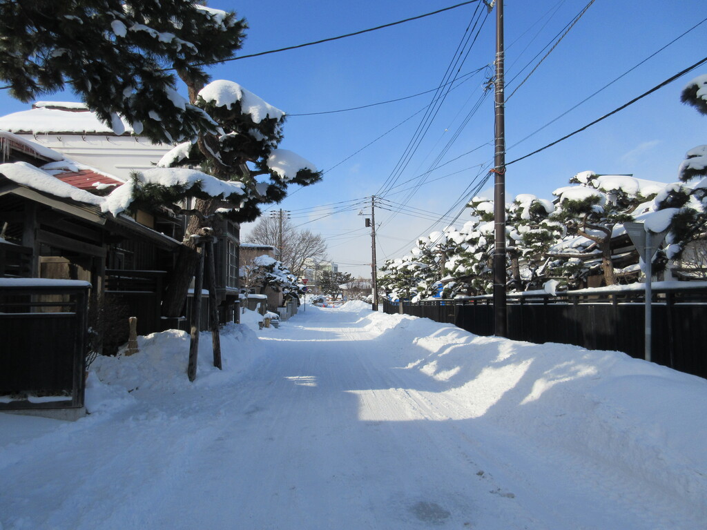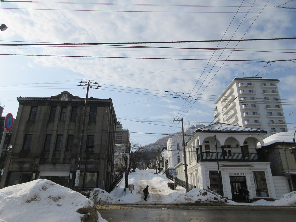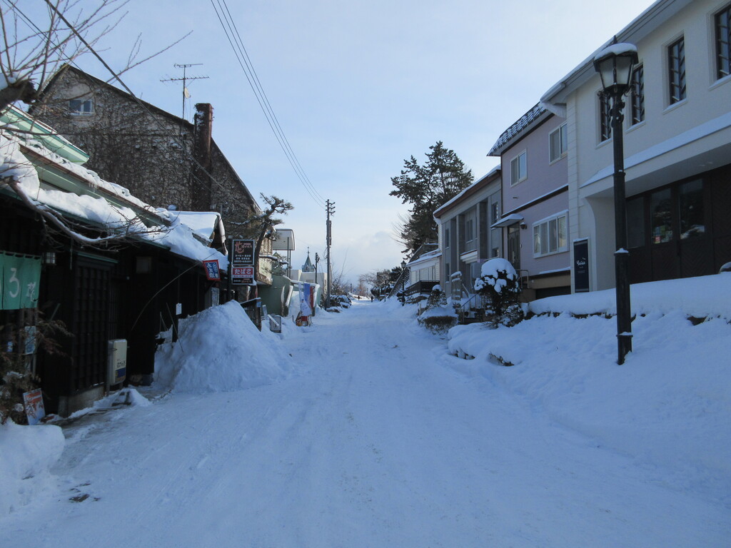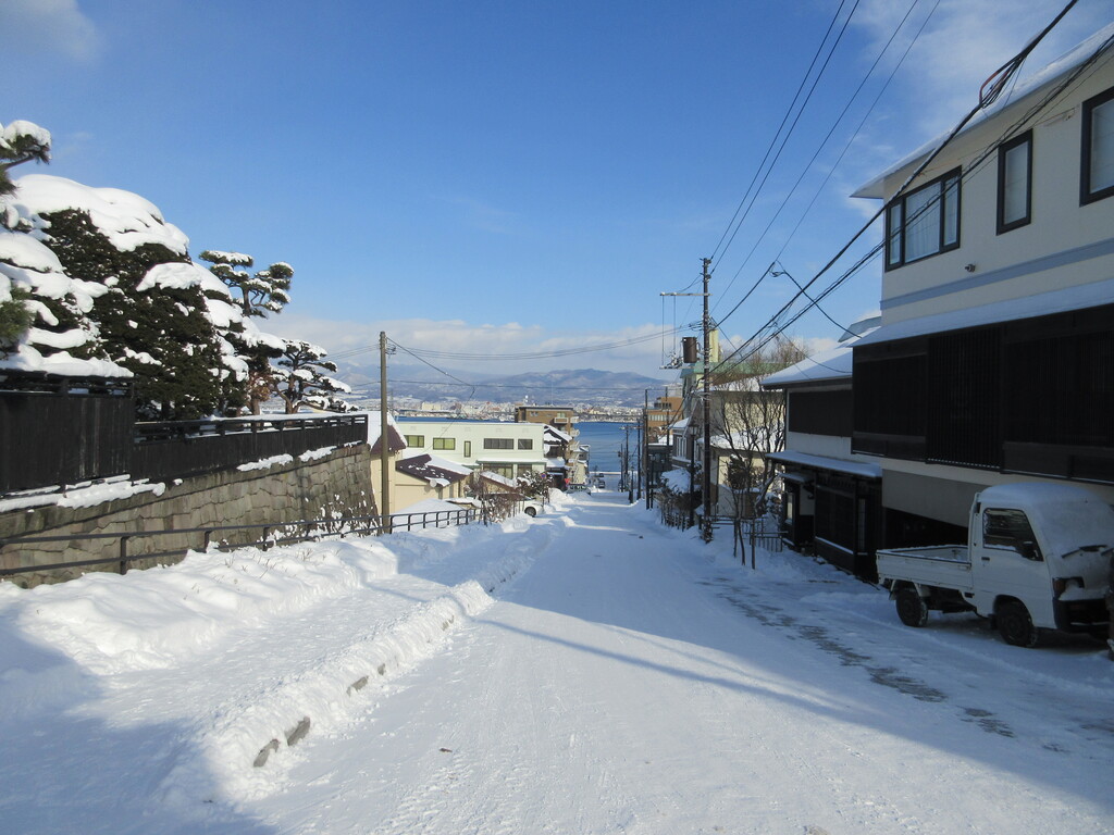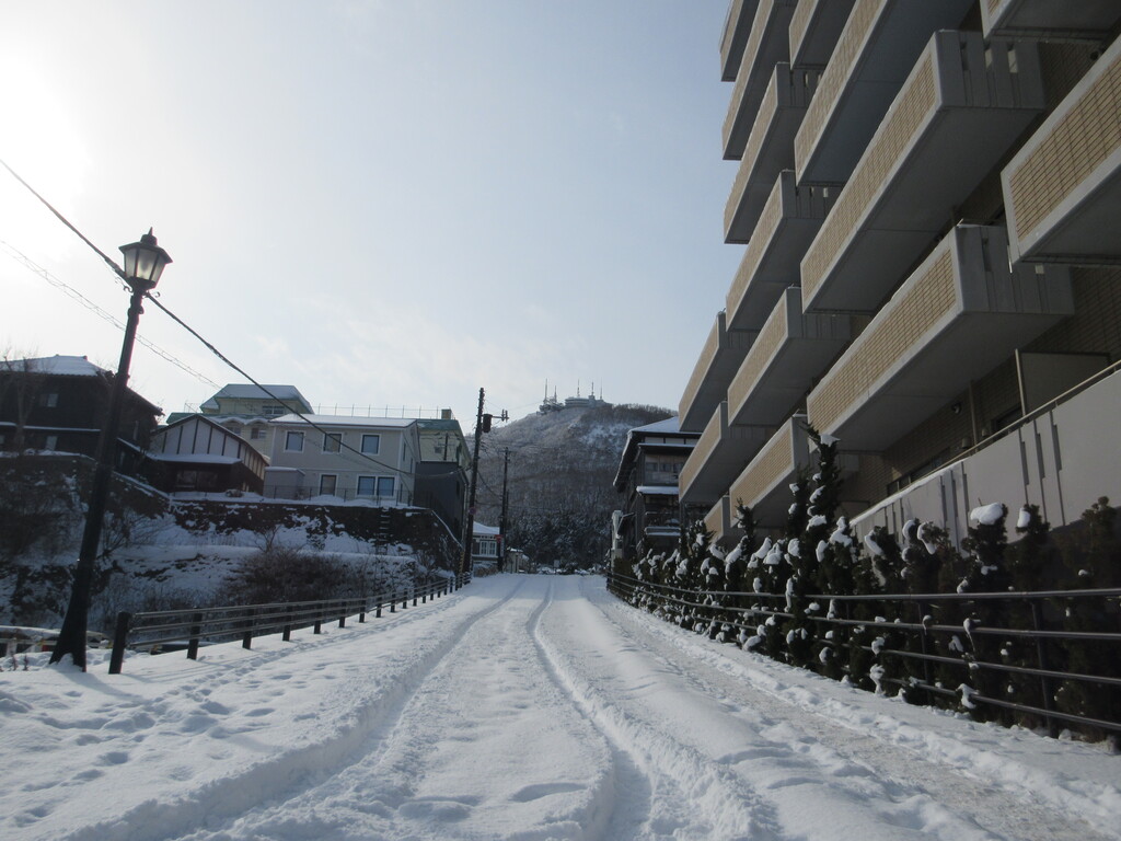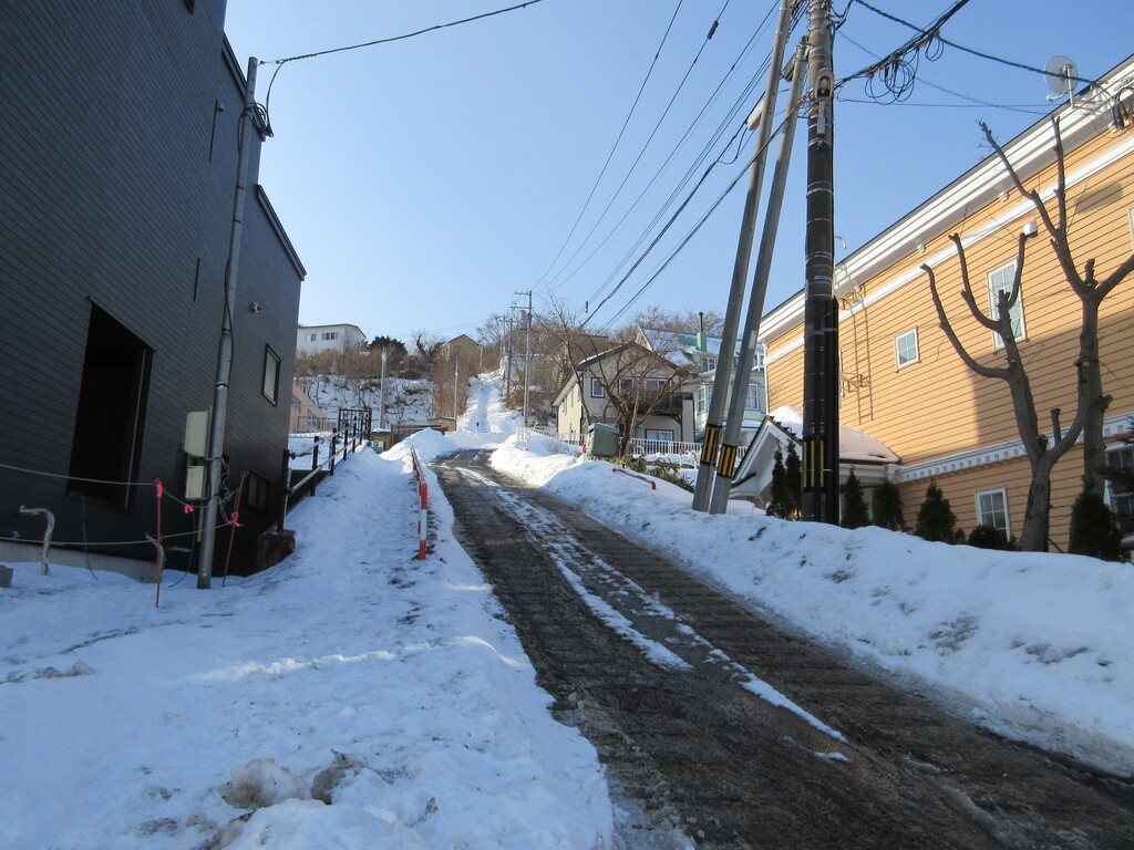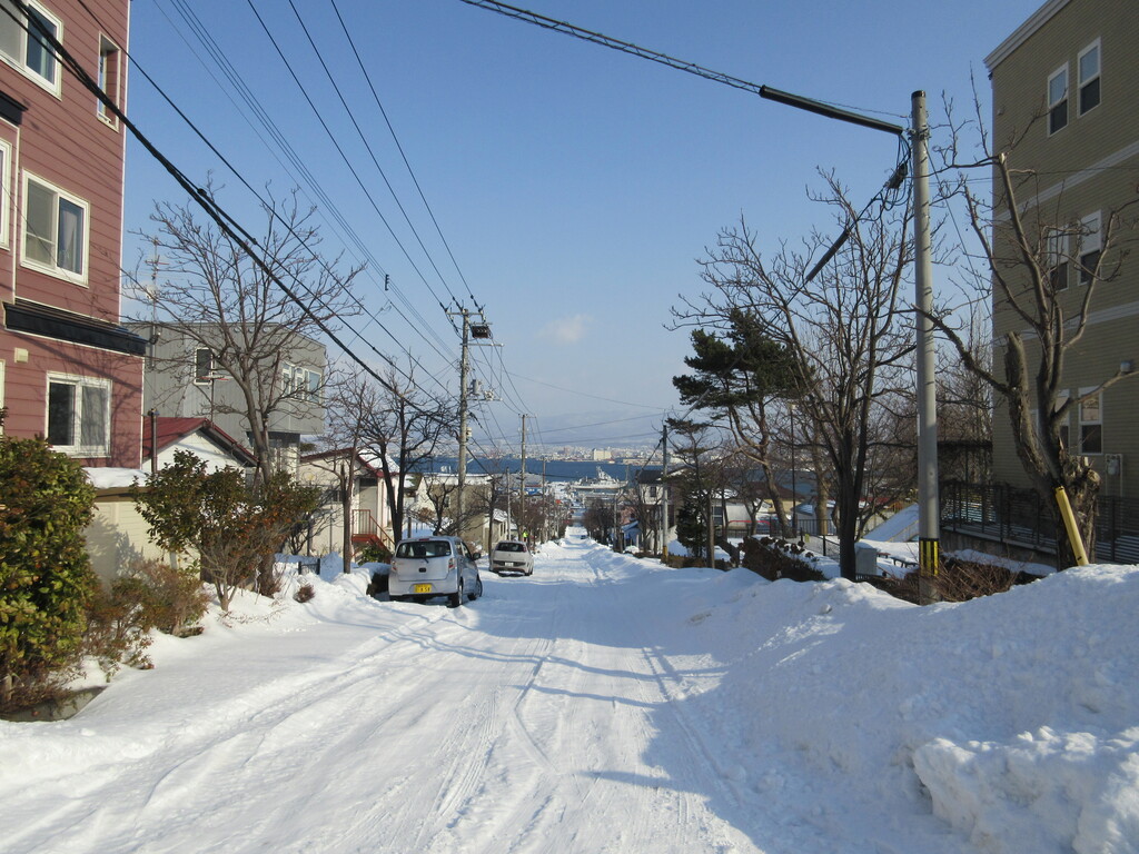 弥生坂を見ると、上の方がロードヒーティングされていて舗装路が見えているけど、下の方は積雪のまま。これは、上の方が急傾斜だからで車で上って行くのが大変なのでロードヒーティングしているのでしょう。坂の途中でスリップして上れなくなったら困りますものね。