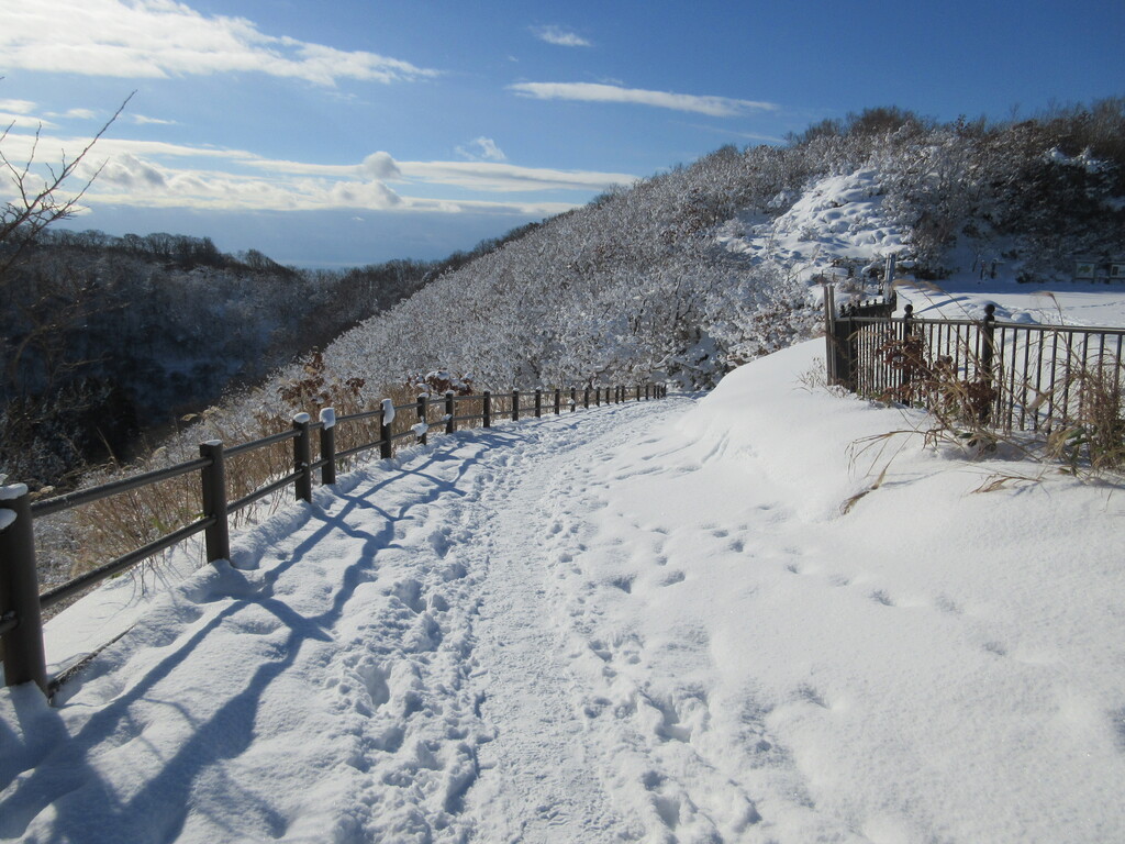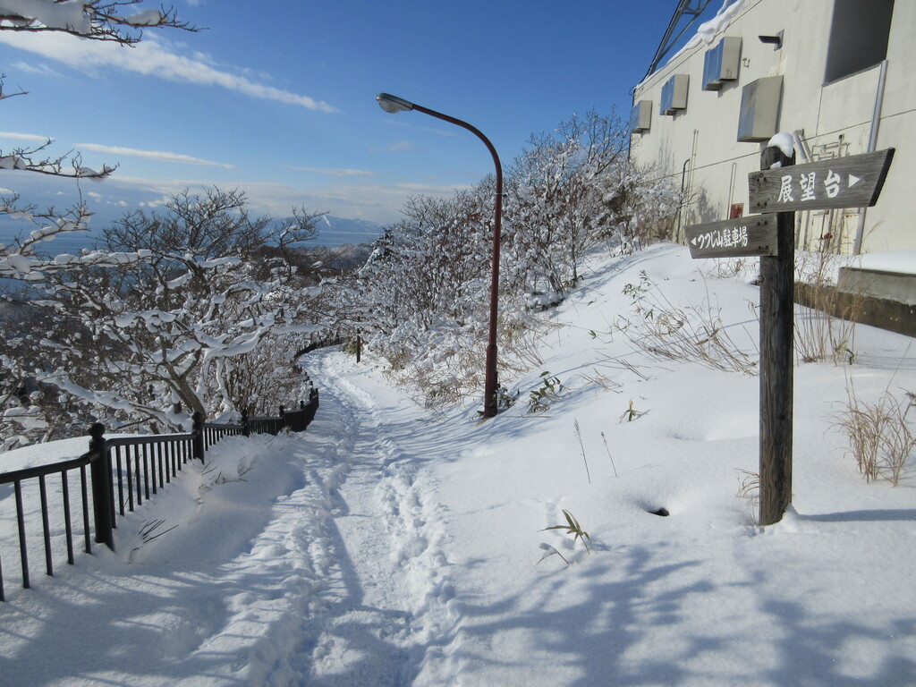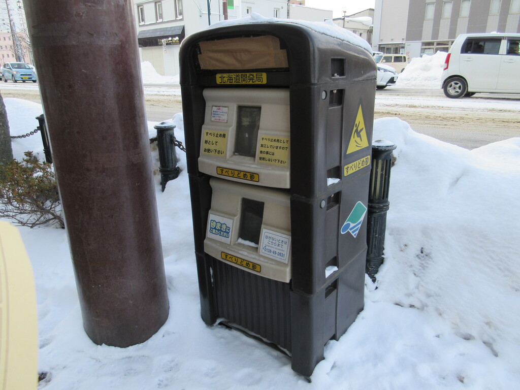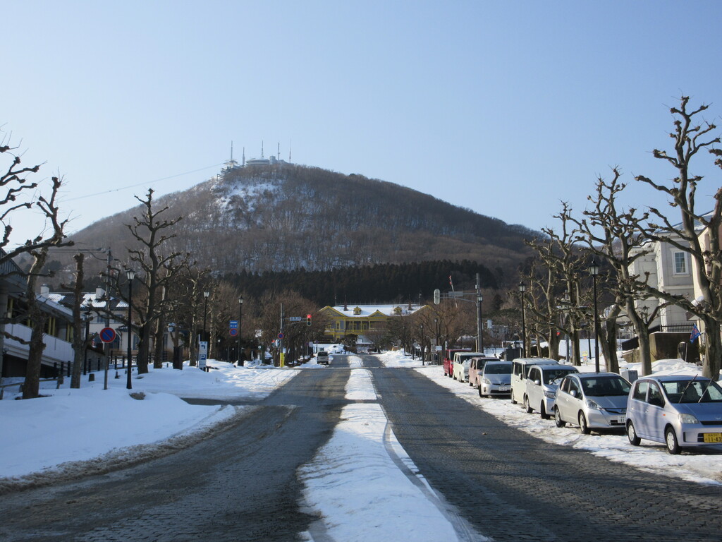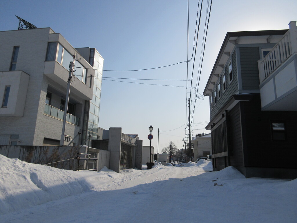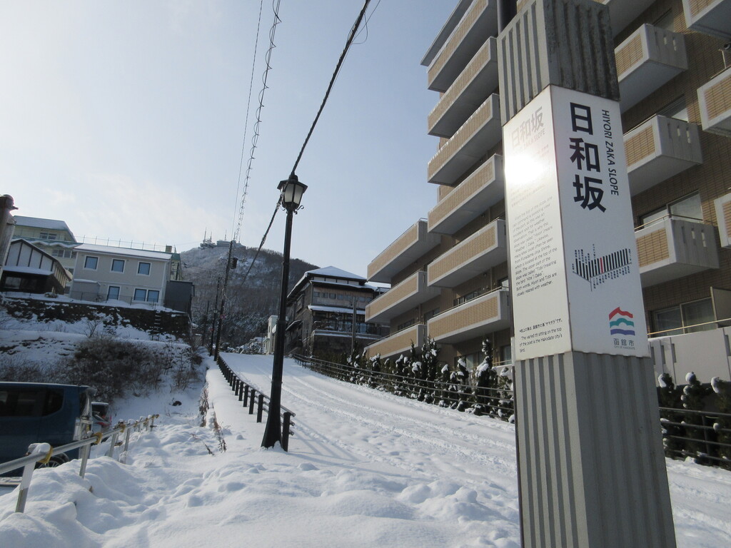 弥生坂を見ると、上の方がロードヒーティングされていて舗装路が見えているけど、下の方は積雪のまま。これは、上の方が急傾斜だからで車で上って行くのが大変なのでロードヒーティングしているのでしょう。坂の途中でスリップして上れなくなったら困りますものね。