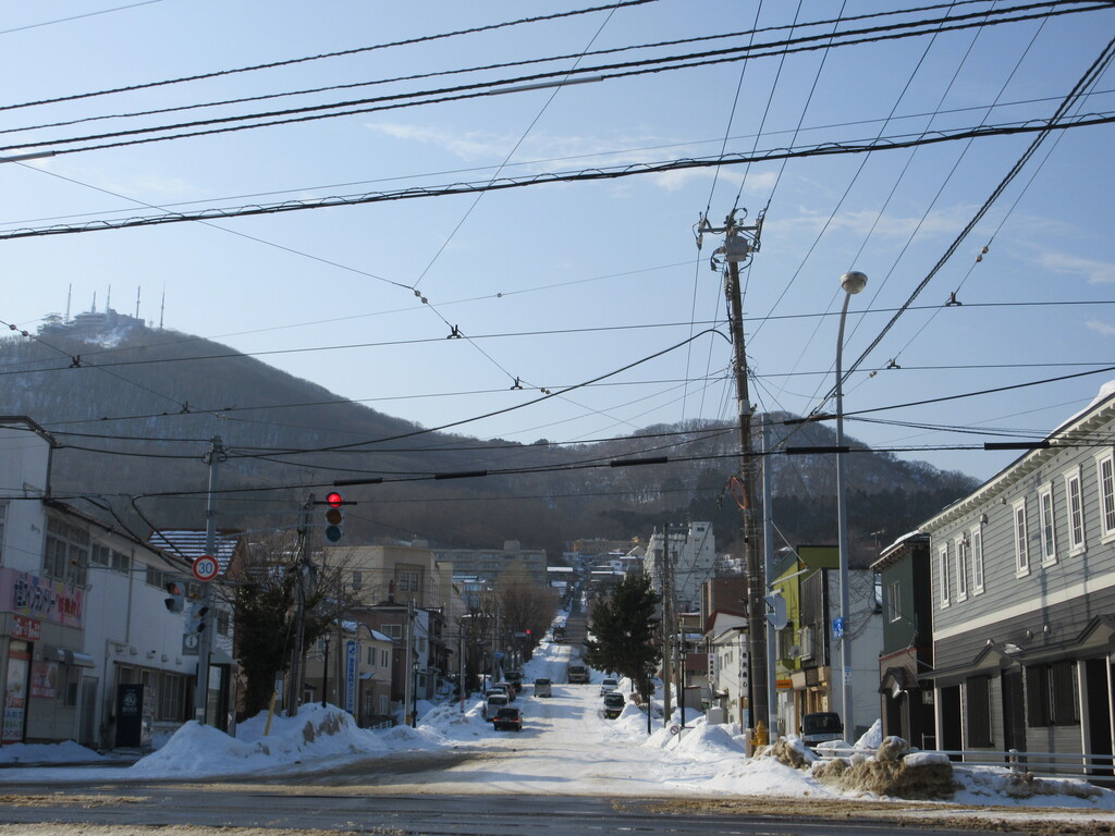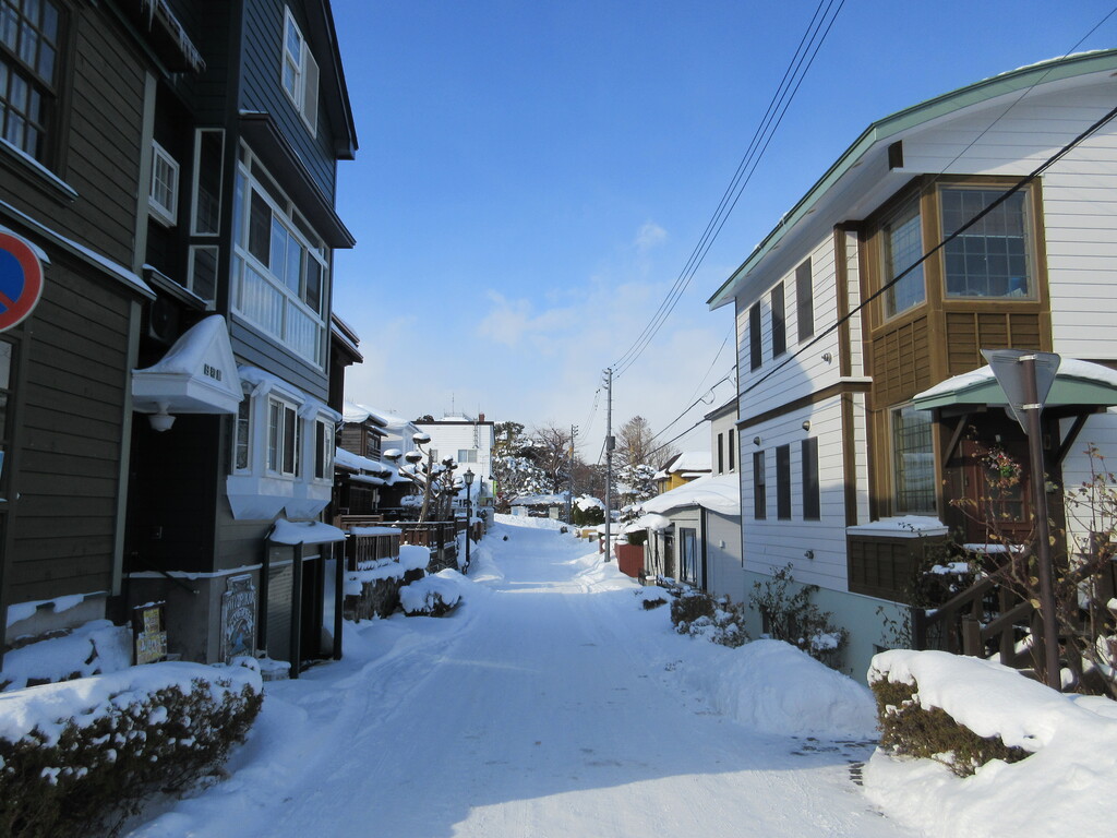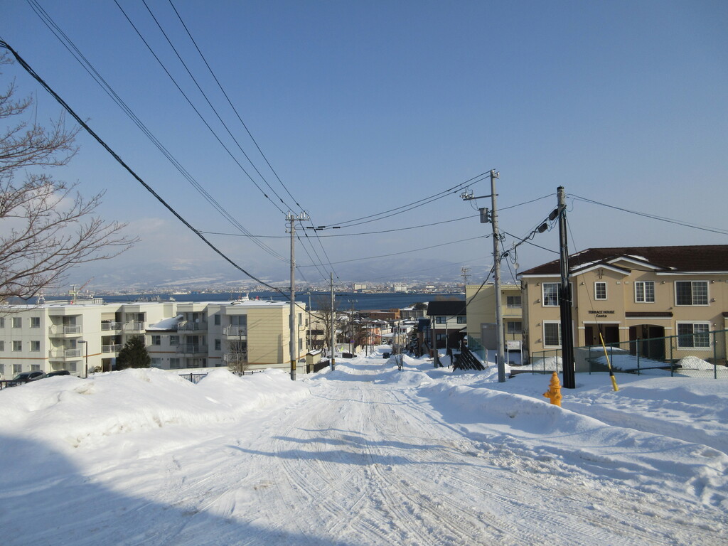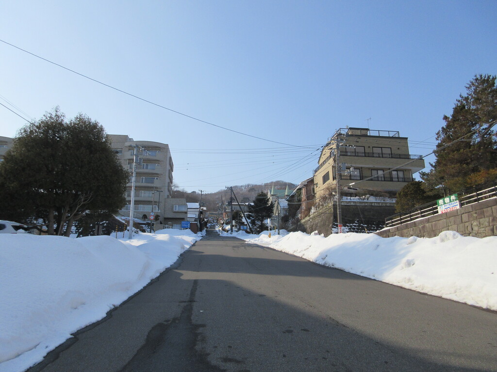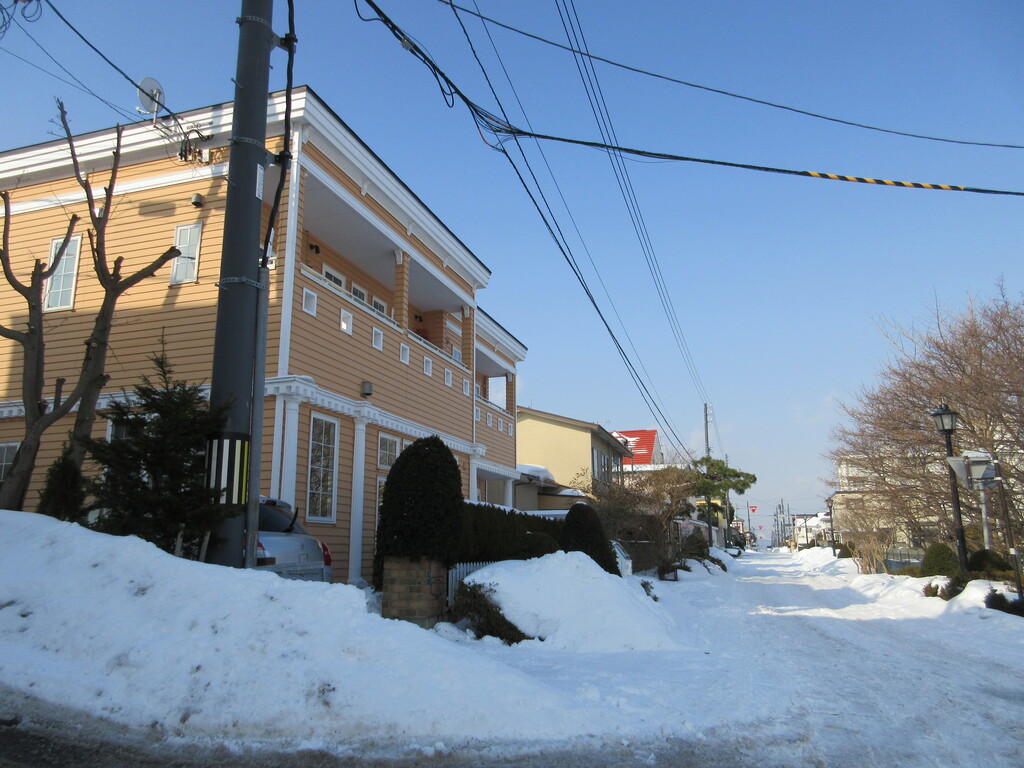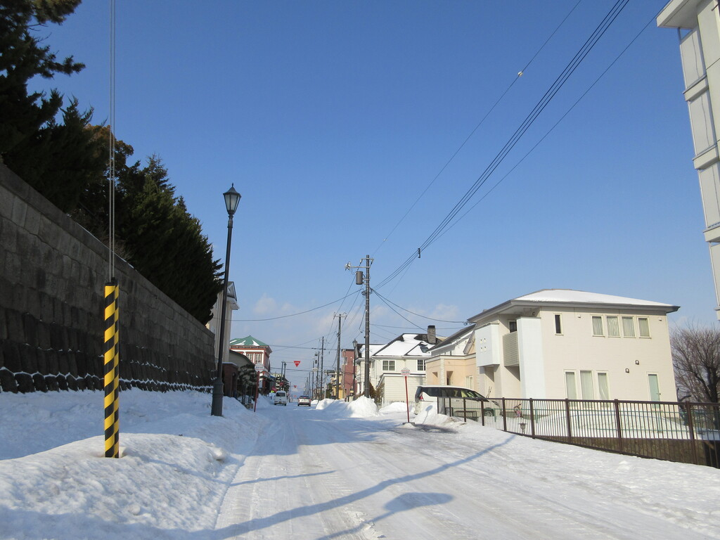 さて、弥生坂から北西方面へ横断します。この辺りも「函館のビバリーヒルズ」らしく私的な家並みが続いています。特に、左側の奥に見える緑の屋根の家などは素敵に映りますね。