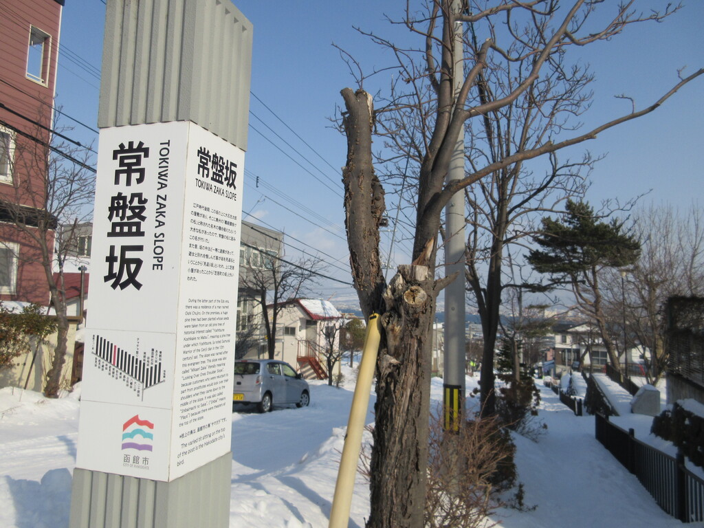 この家のある場所は常盤坂の角地。常盤坂の由来は、『はこだて歴史散歩」によれば、「江戸時代後期、この坂の上に大石忠次郎という屋敷があり、そこに大きな松の木があった。これは岩手県の義経腰かけの松と称された名木の種を持ってきて植えていて、近隣の名物となっていたそうな。その松の緑から常盤坂という町名が生まれて、坂も常盤坂となった」と。