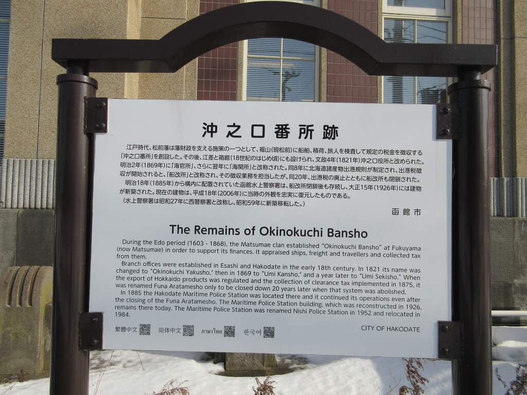江戸時代は、ここに松前藩の「沖の口番所」があって、松前藩の税務署みたいな役所で、出入りする船・荷物・旅人から税金を徴収していました。