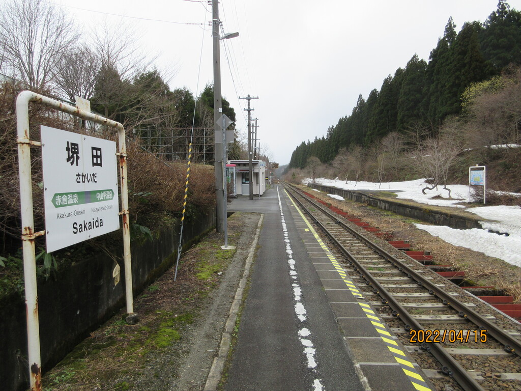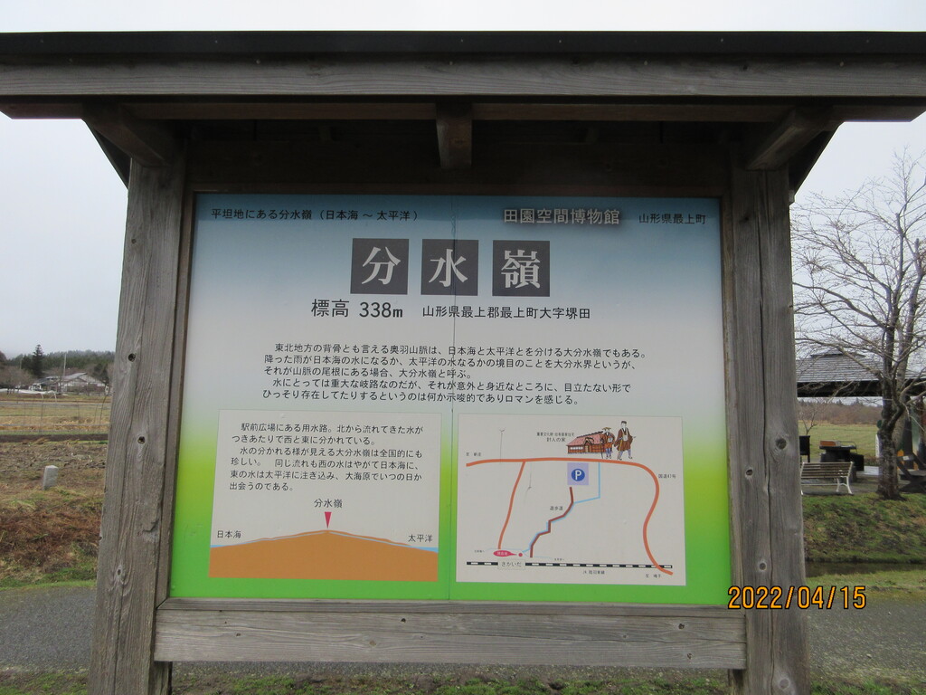 堺田駅に行くと、「分水嶺」の看板。標高338mのここは山から流れてきた水が、ここで東(太平洋)と西(日本海)に分かれるのです。