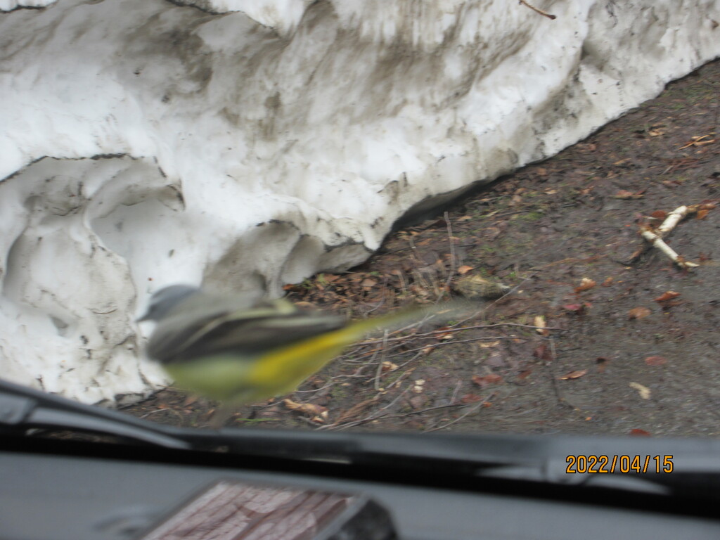 山刀伐(なたぎり)峠へ行こうとしたら、雪深く通行止め。停まっていたら、一羽の野鳥が飛んできて車から離れません。