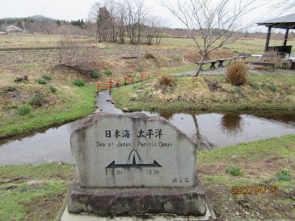 日本海へと流れる川は「明神川から小国川と名を変え、最後は最上川の名で山形県酒田市で日本海へと流れます。一方、東へ流れる川は大谷川から江合川(荒尾川)へ、最後は北上川に合流して太平洋へと流れます。