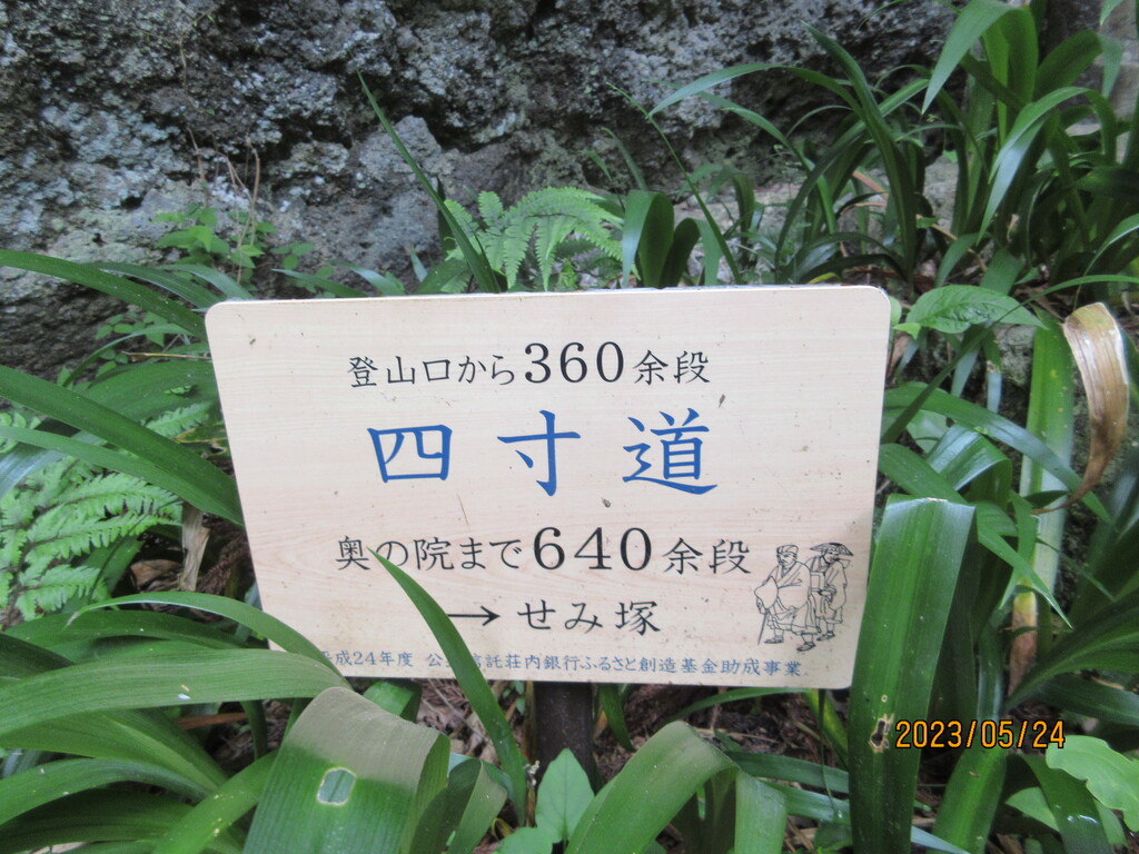 この看板には、登山口から360余段、奥の院まで640余段とあり、合わせて1000余段。