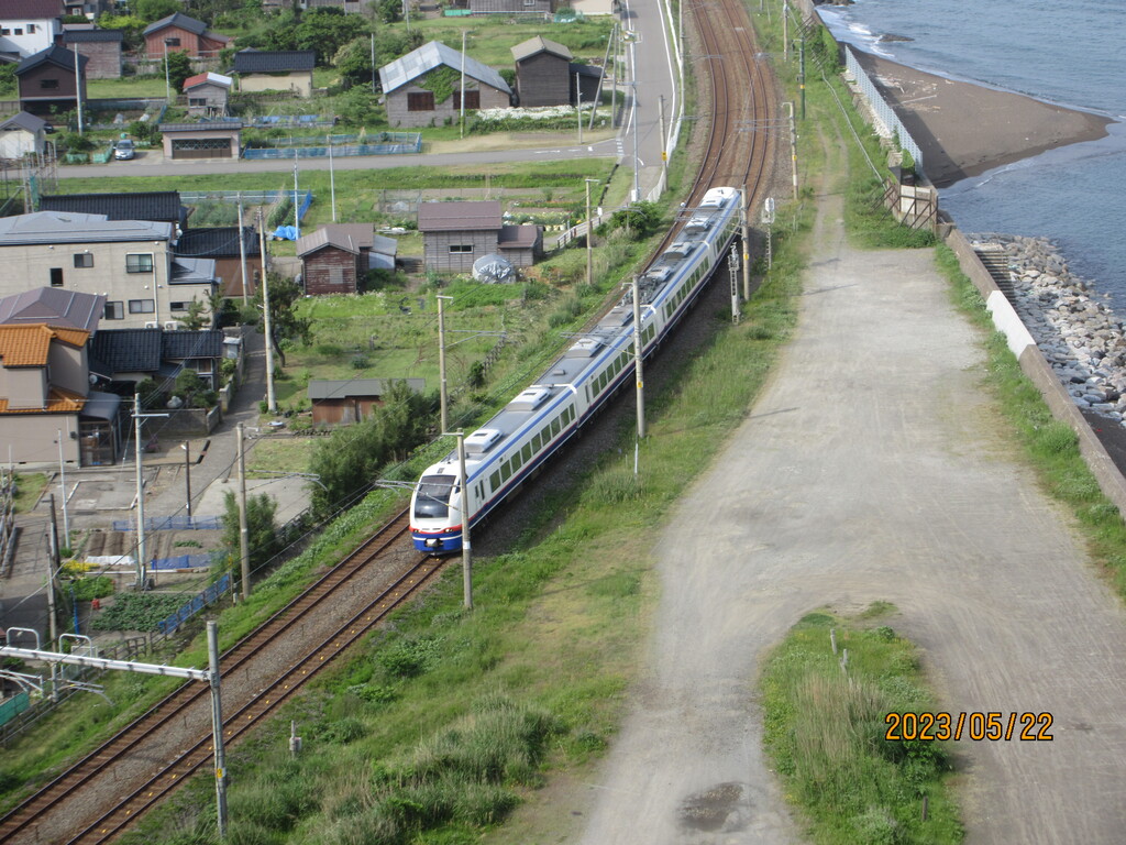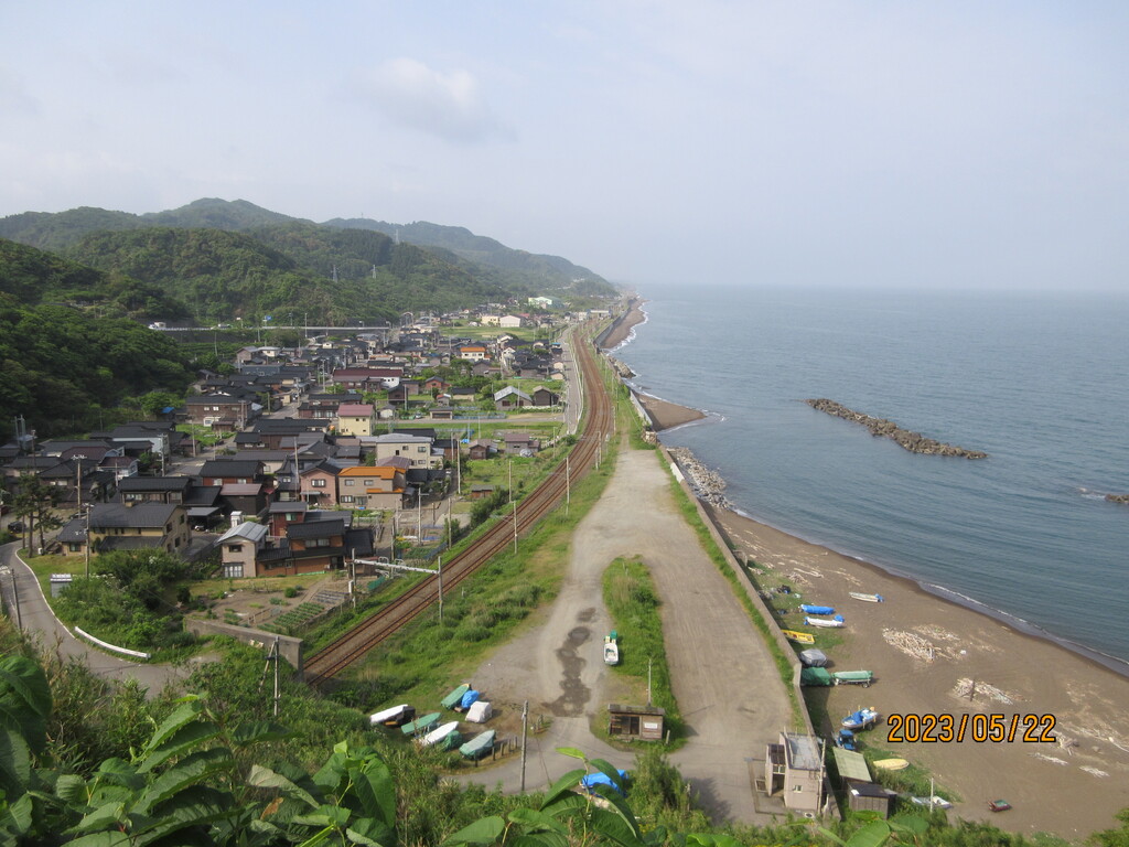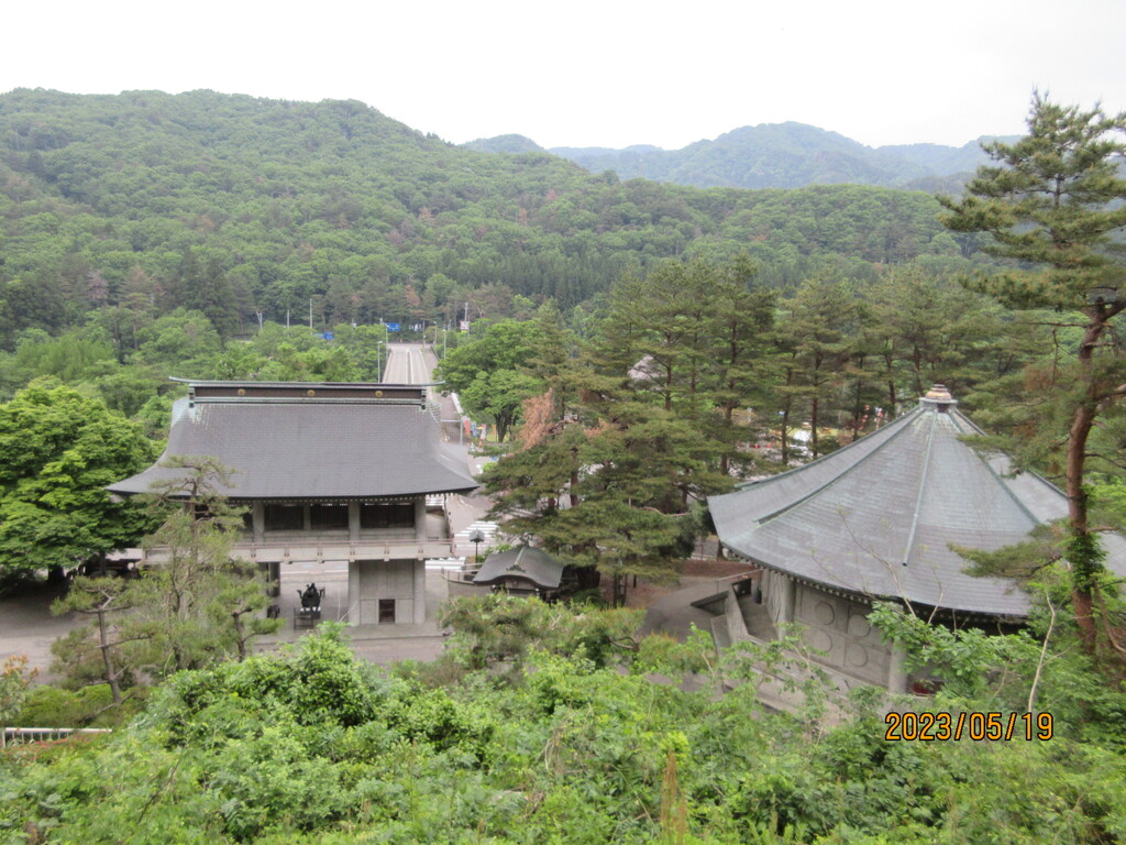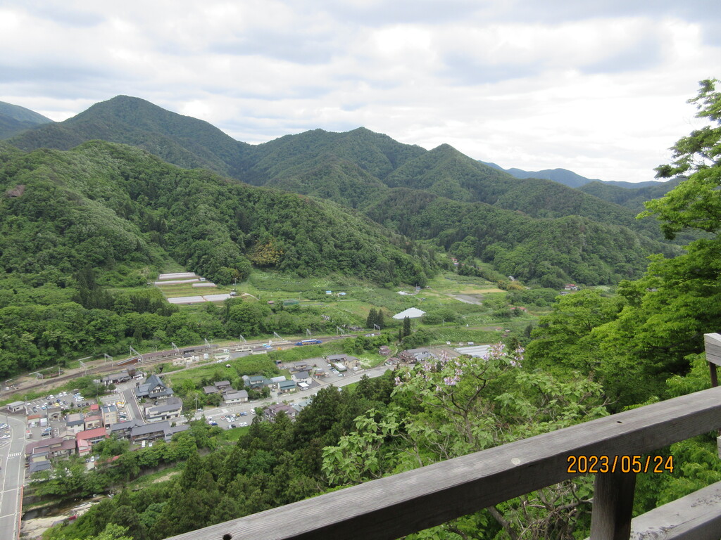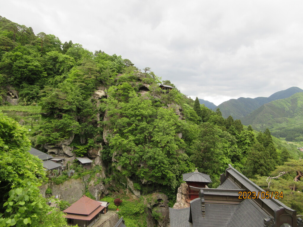 自分は20分ほどで登ってきました。展望の良いところから下界を撮影。鉄道が見えていますが、山形駅と仙台駅を結ぶJR東日本の仙山線の駅である山寺駅がありますね。
