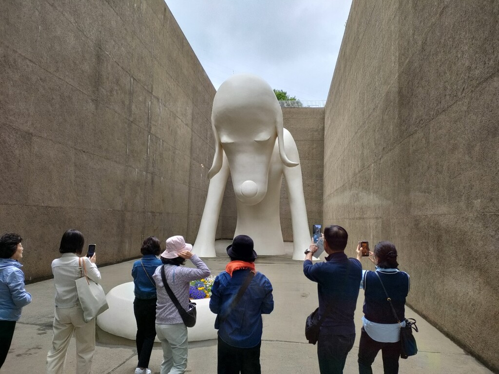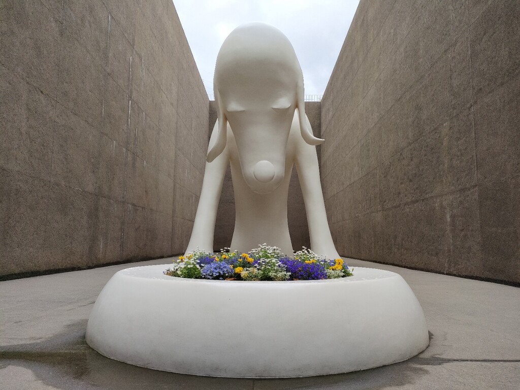 巨大なオブジェの犬。ここへ行くには、今いる場所から階段を登り降りして、まるで迷路を通るかのようにして歩くこと5分で辿り着けます。後から犬の前に行きます。