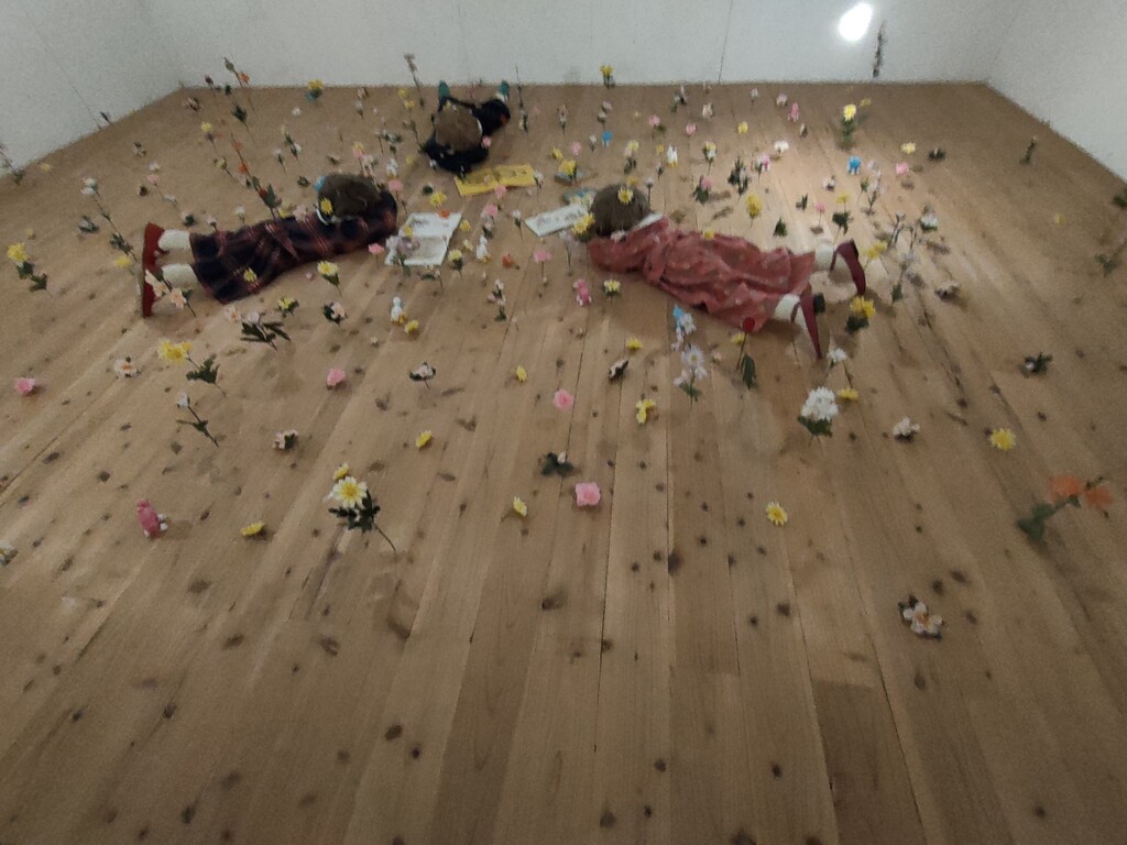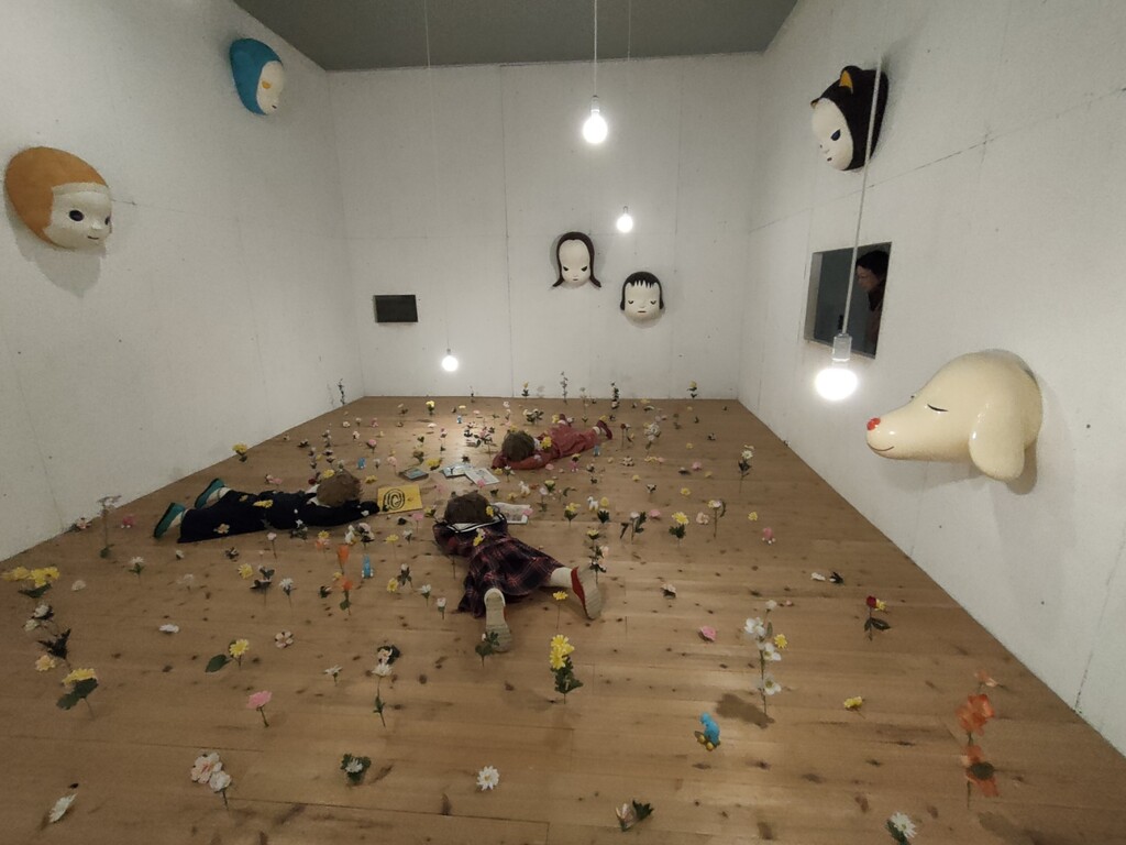 10畳間くらい空間に3人の子供の人形とその他置物。見応えあります。