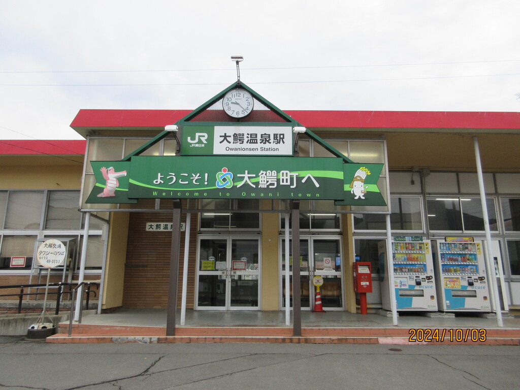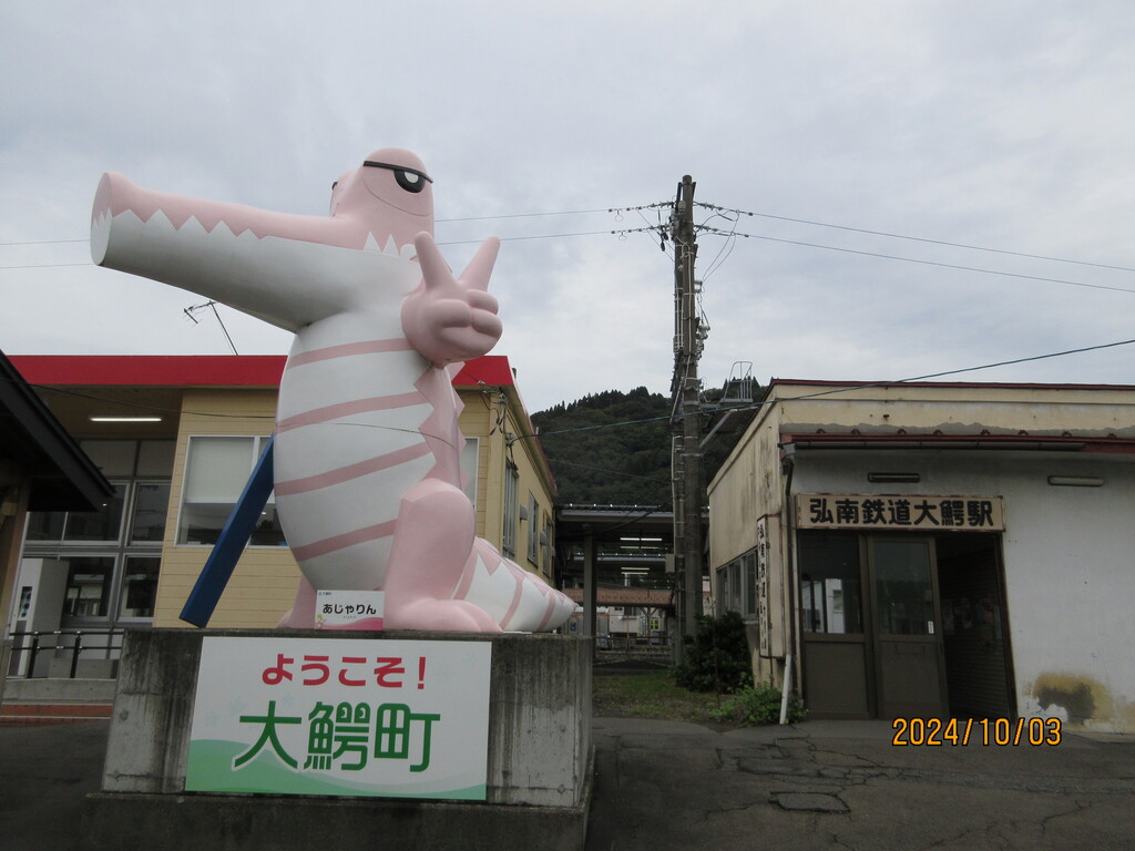 大鰐の名前の通り、駅前には大きな鰐さんのオブジェが。その奥には弘南鉄道の終着駅である大鰐駅があります。弘南鉄道とは、黒石市の黒石駅までの弘南線と大鰐町の大鰐駅までの大鰐線の、2つ路線を持つ民間の鉄道会社で、つまり私鉄なのです。