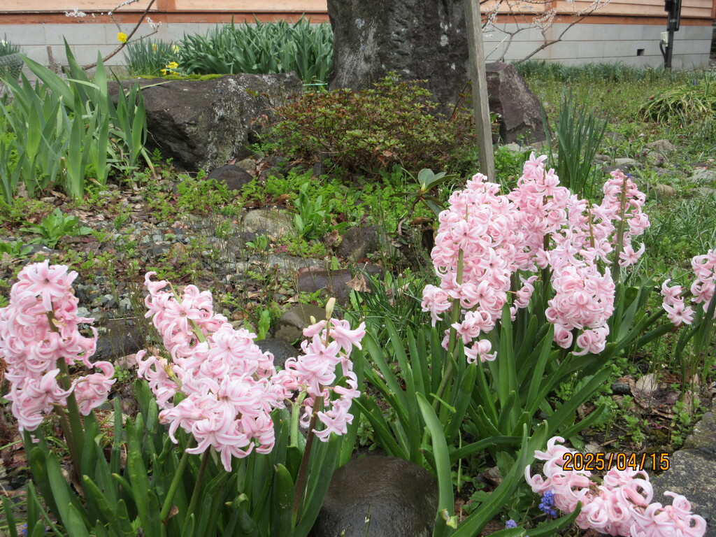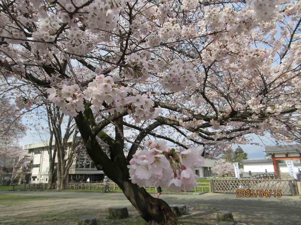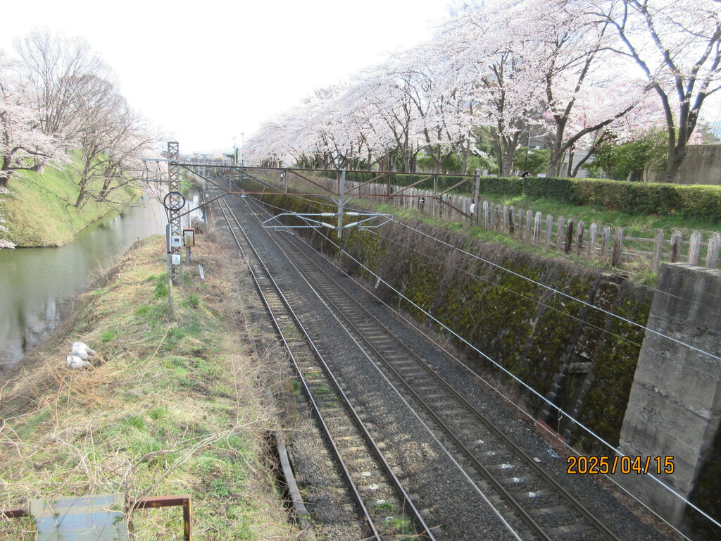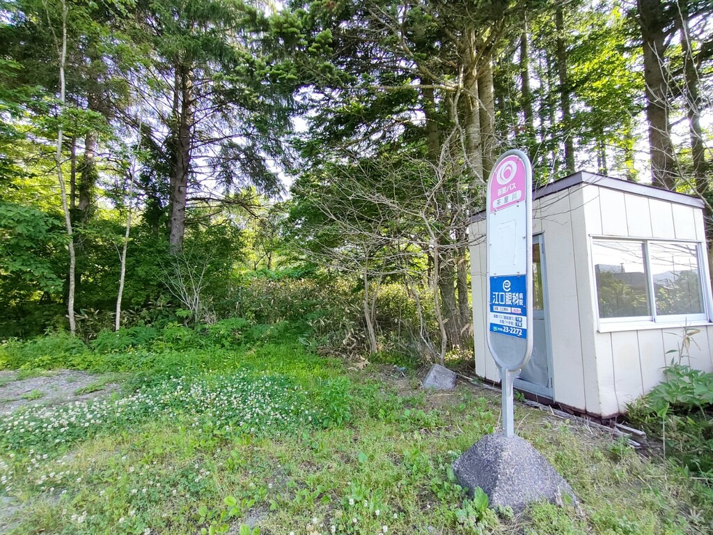 真下には地元住民が毎日掃除している清潔なトイレとピンク色のポスト、それとバス通学するための子供たちの待合所があります。桜が満開できれい!