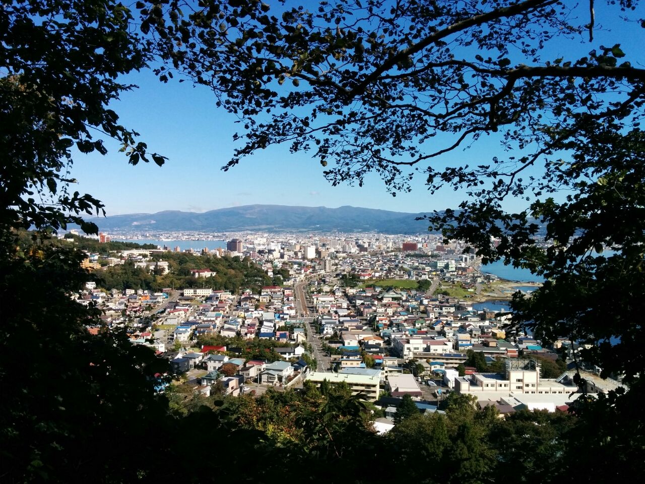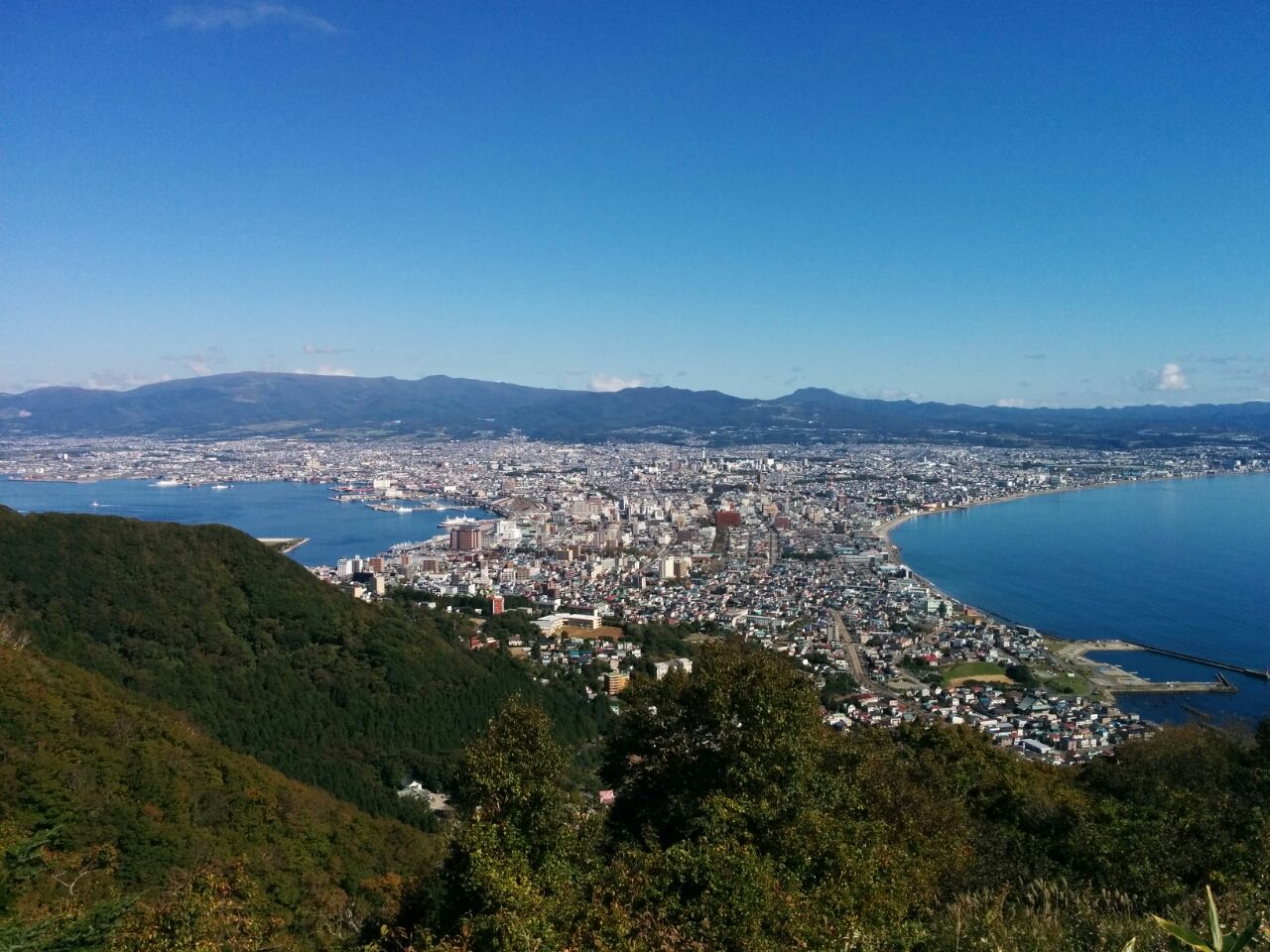 下に見えるのは、鞍掛山と立待岬。津軽海峡を挟んで下北半島も見える。
