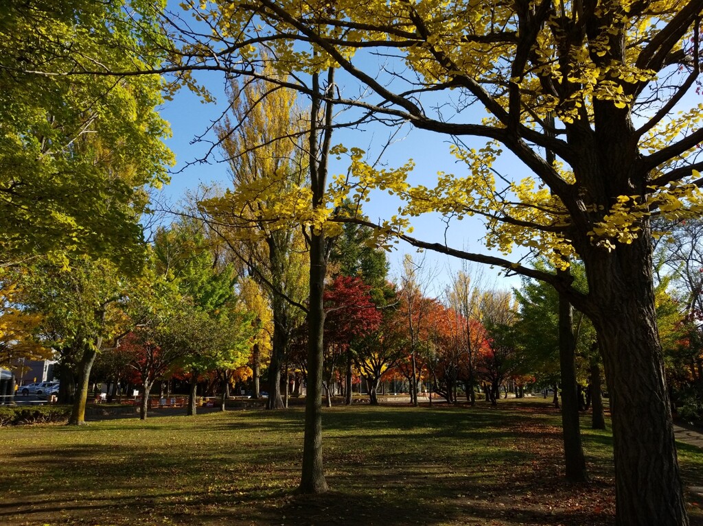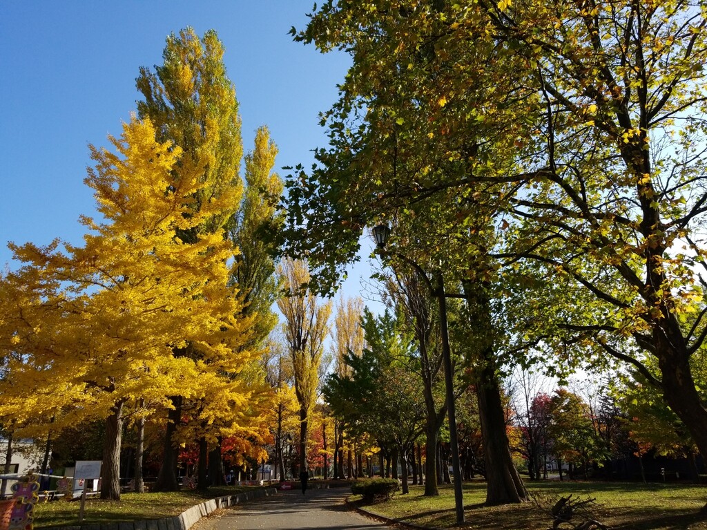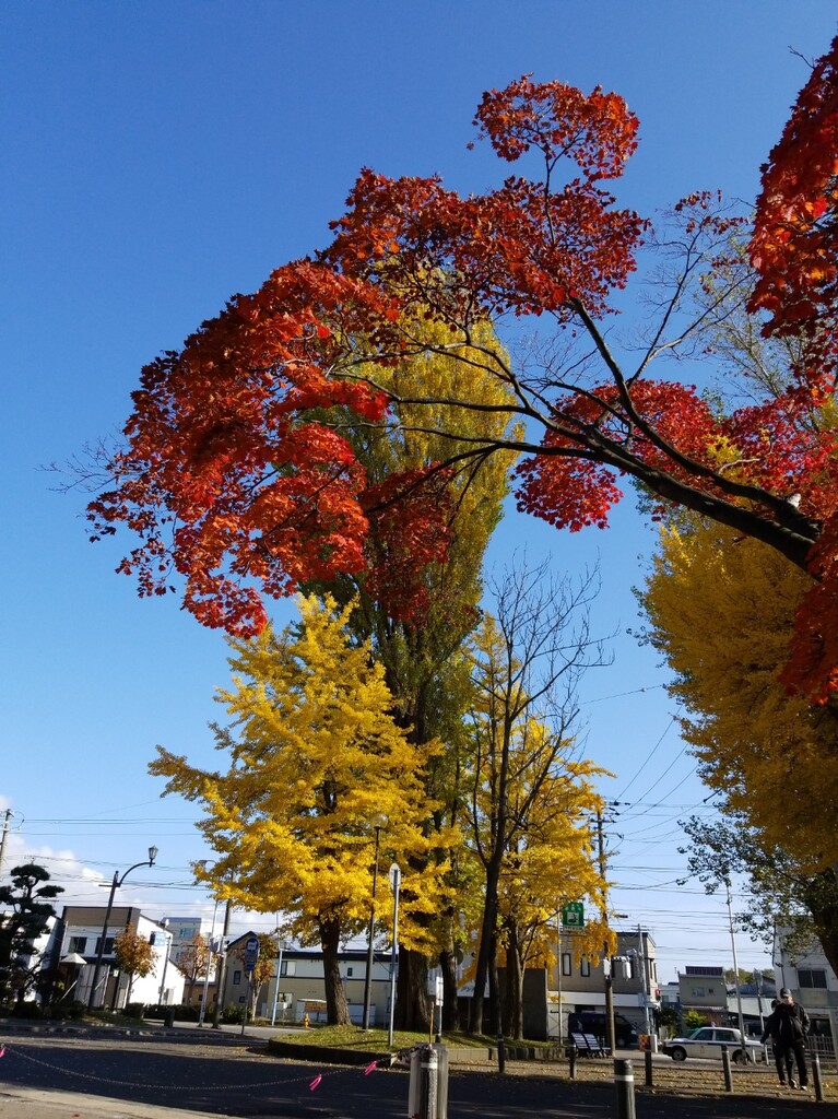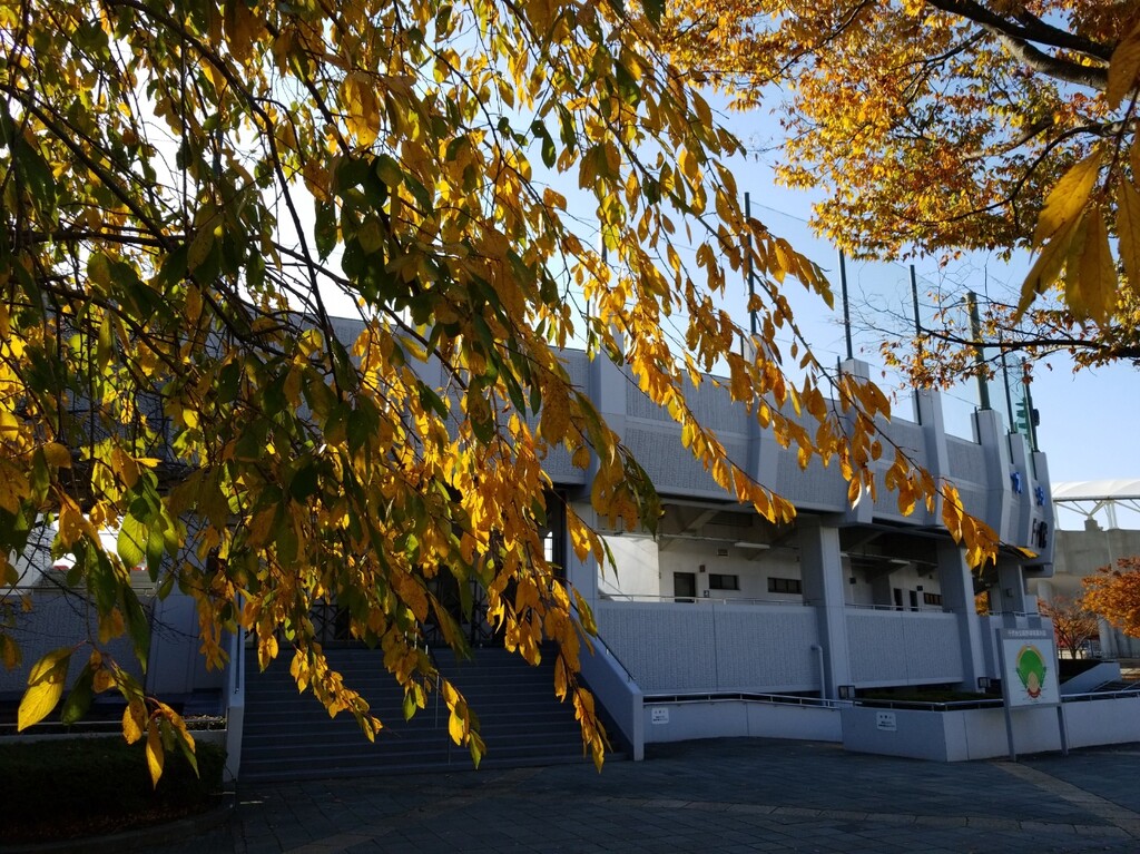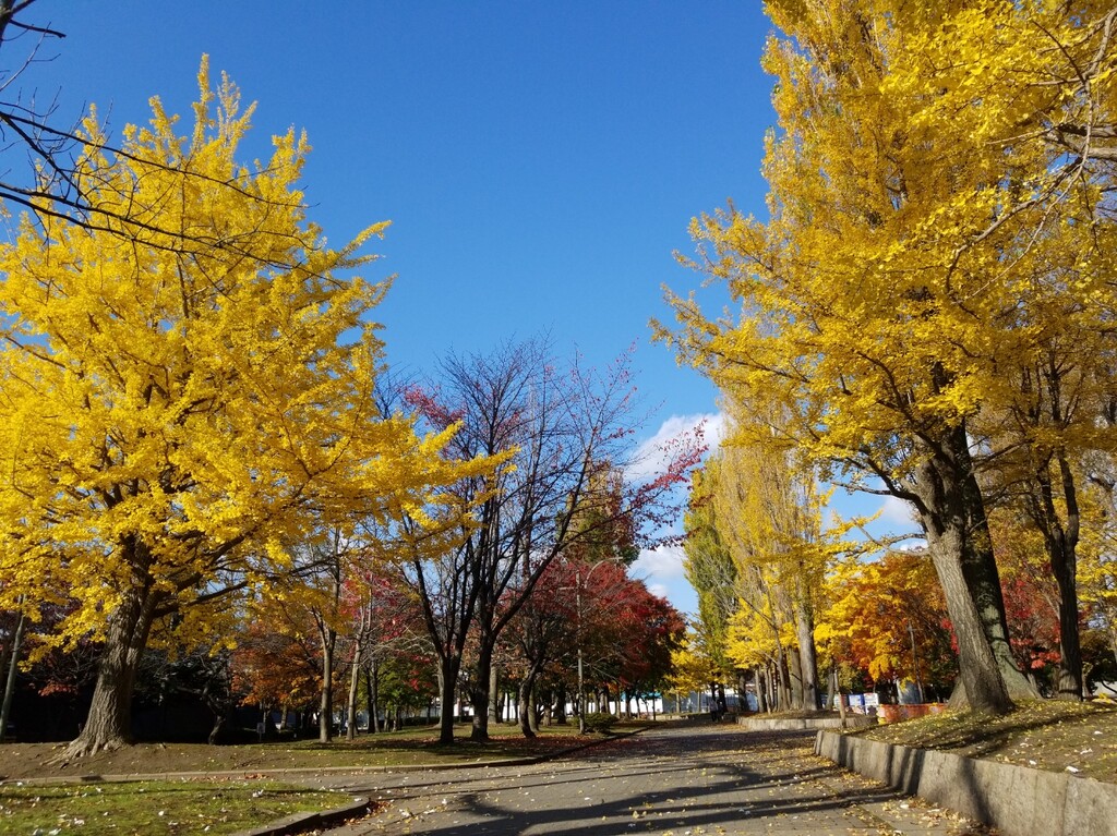 まずは、千代台にあるスポーツ施設が集中している場所へ。ポプラと銀杏の紅葉が素晴らしい!青空に映えますね。