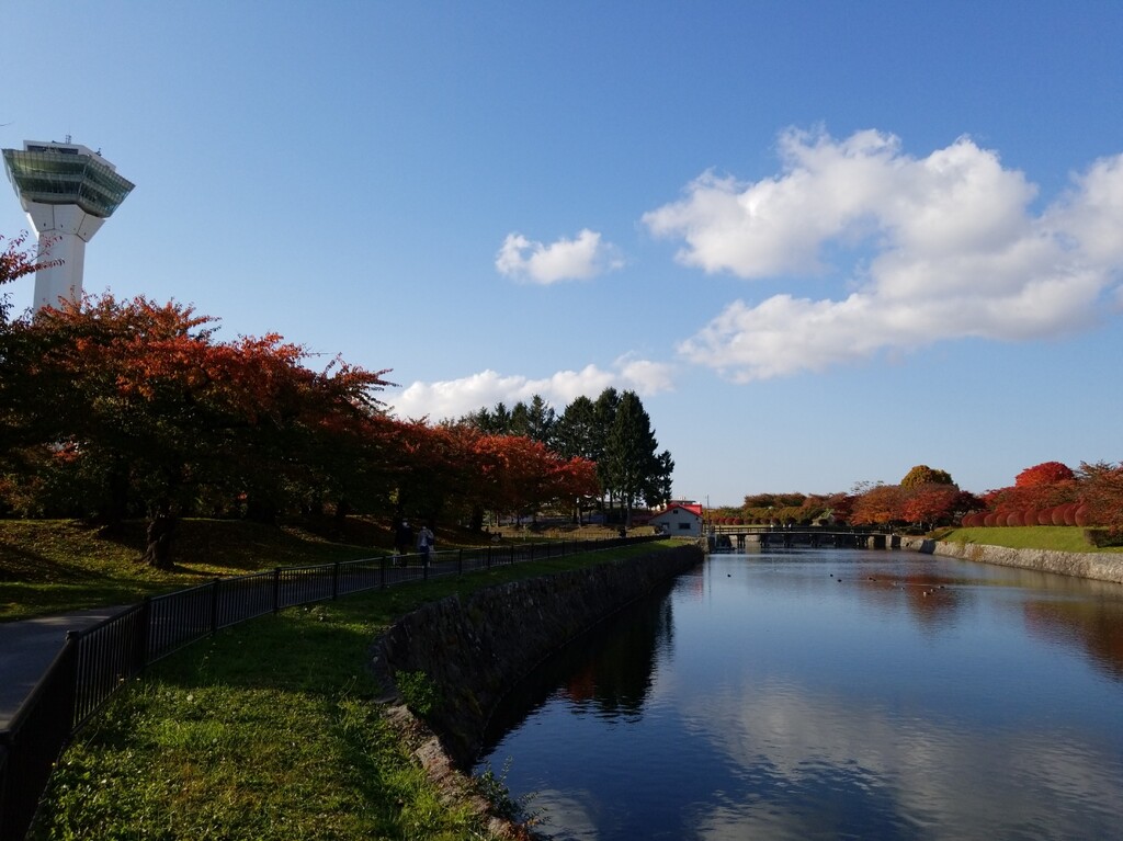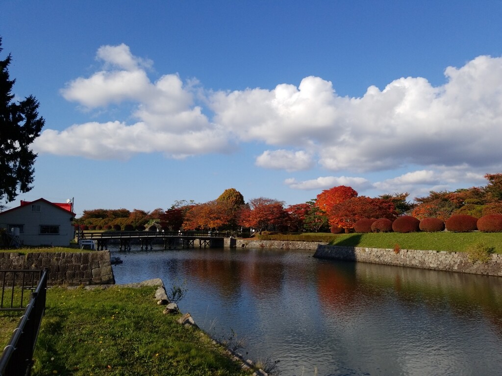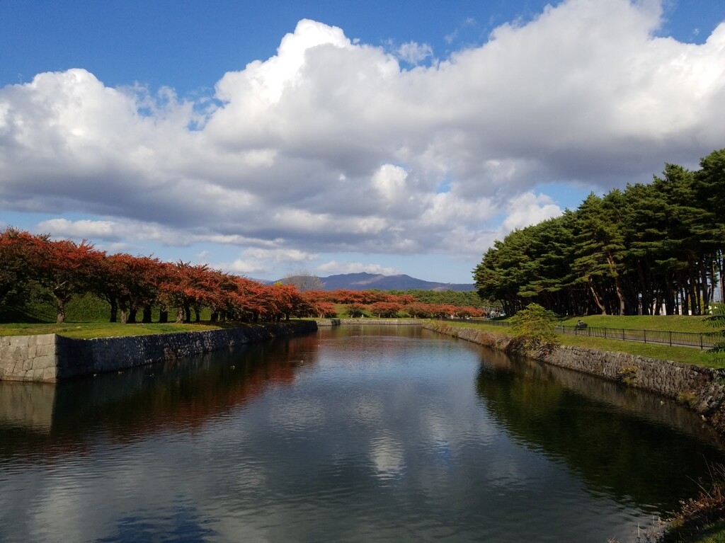 真っ赤な葉っぱは、ツツジでしょう。青空と白い雲、赤い木々の葉、堀の水色。絵になる風景です。