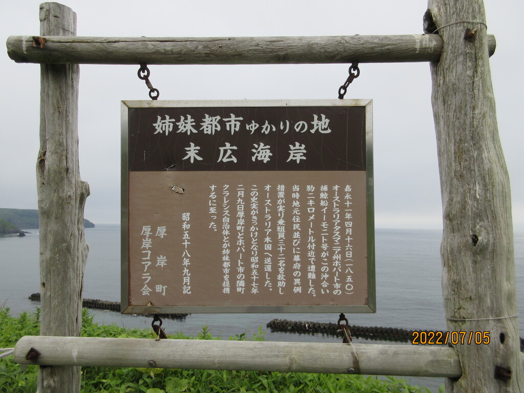 少し進むと、末広海岸へ。ここは、江戸時代後半というか末期に近い1850年にオーストラリアの南にあるタスマニア島ホバートから捕鯨船が来て、ここの沖合で遭難。厚岸の住民は乗組員32名を救助したそうな。