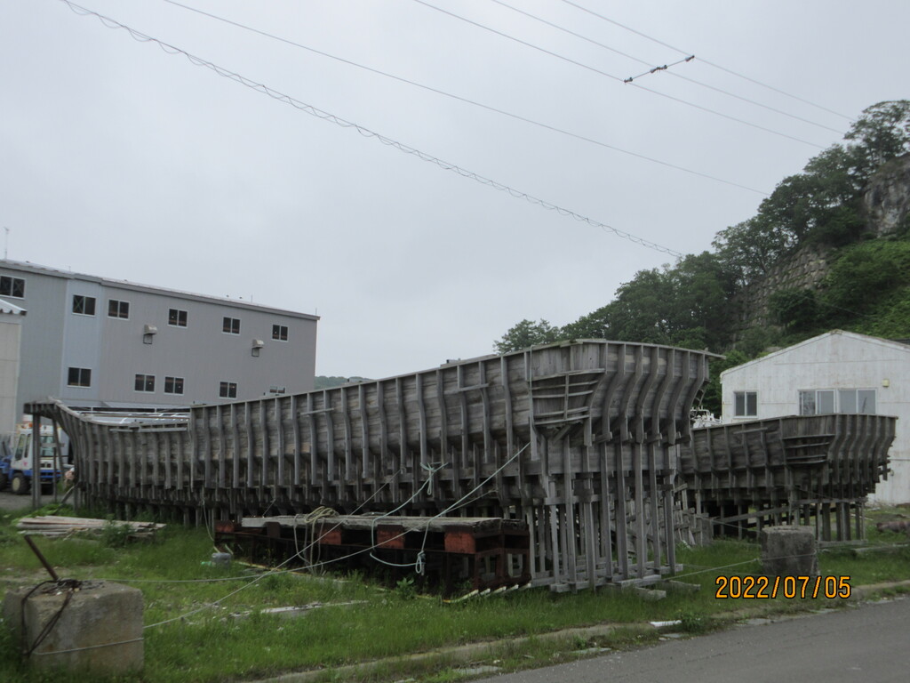 漁業の町らしく小さいけど造船所がいくつもあり、そばにはこんな木造船が置かれていてビックリ!まるで江戸時代の北前船みたいな構造ですよ。