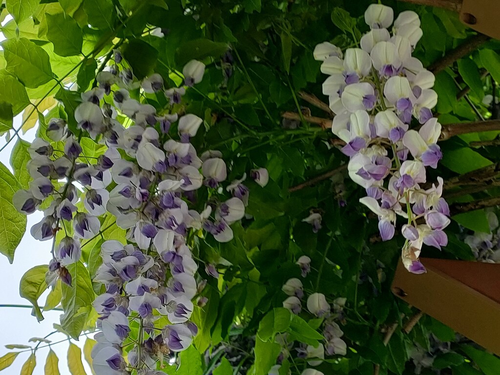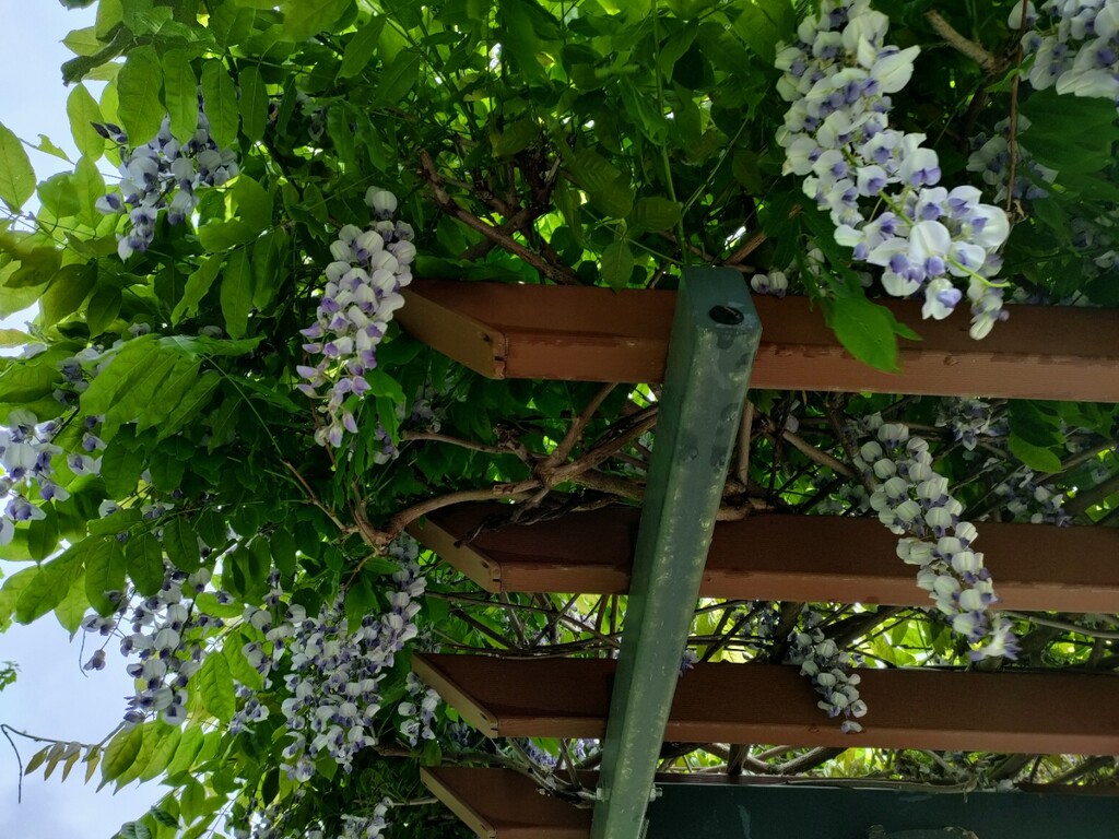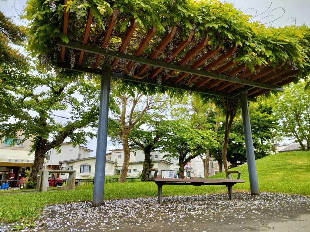 そのそばのベンチでは、屋根に藤棚の木があり藤の花が満開。一部は落ちていて、藤の花の匂いがいっぱいです。