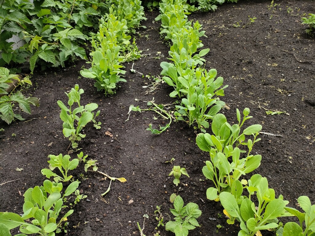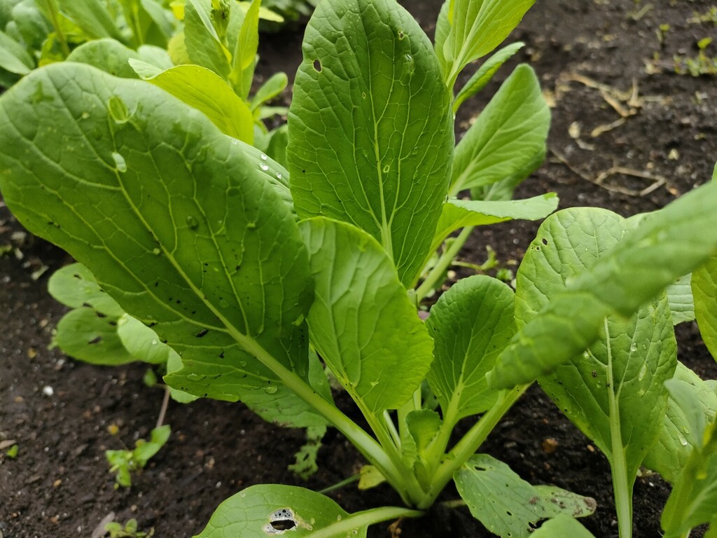 隙間なく植えられ育った小松菜を間引きします。所々、穴が空いているのは農薬を使わないから虫食いの穴です。