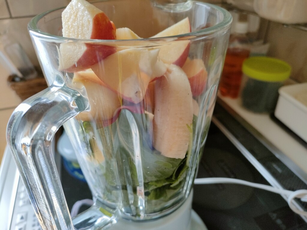 先程の細かくした小松菜は、リンゴ半分とバナナ1本と一緒にミキサーへ。