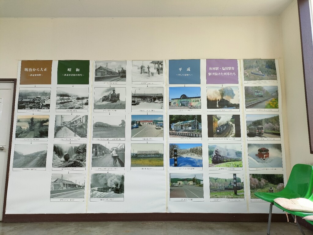 無人駅ですが、駅舎内にも明治の時代からの駅風景が35点紹介されています。左には駅の歴史年表もありました。