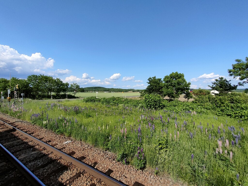 ホームに立つと、ルピナスの花と広大な小麦畑。