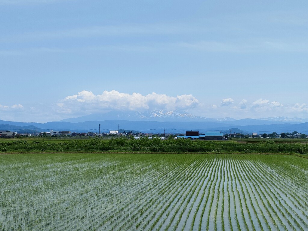 田園風景の中に、遠くに雪を頂く2000m級の大雪山系の山々。