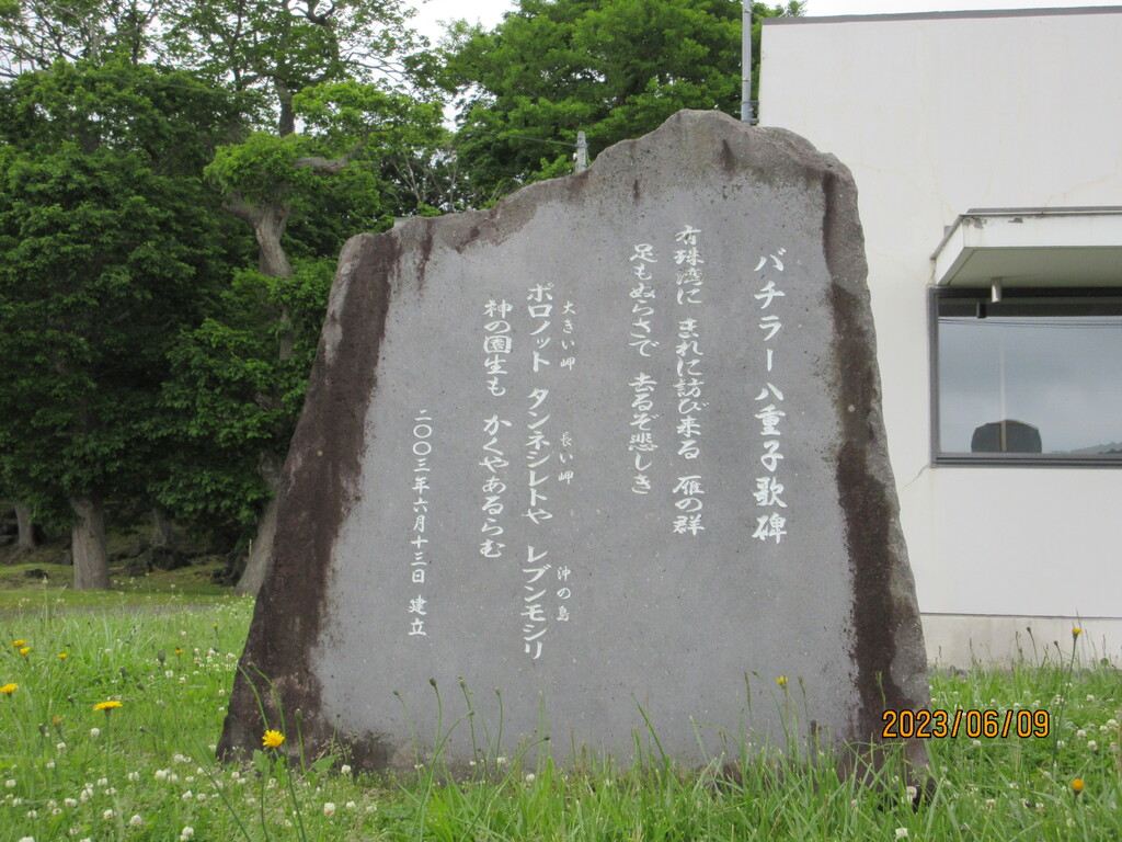 そのとなりには、伊達市有珠地区コミュニティーセンター白鳥館があります。前庭にはバチラー八重子の歌碑があります。