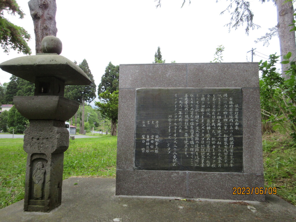 善光寺から少し行った場所へ。数台停めれる広さがある地へ車を停めます。一部見えない部分もあるけど、織部燈篭の説明がありますね。