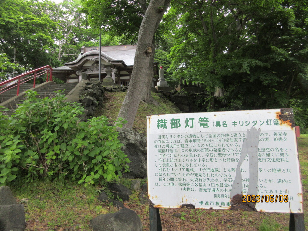 潜伏キリシタンの燈篭で、江戸時代の前の安土桃山時代の茶人であった古田織部が創建した作なので、織部燈篭と云われているようです。
