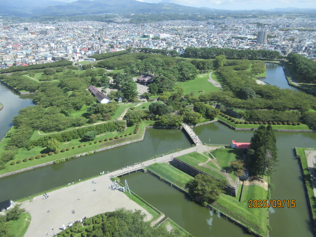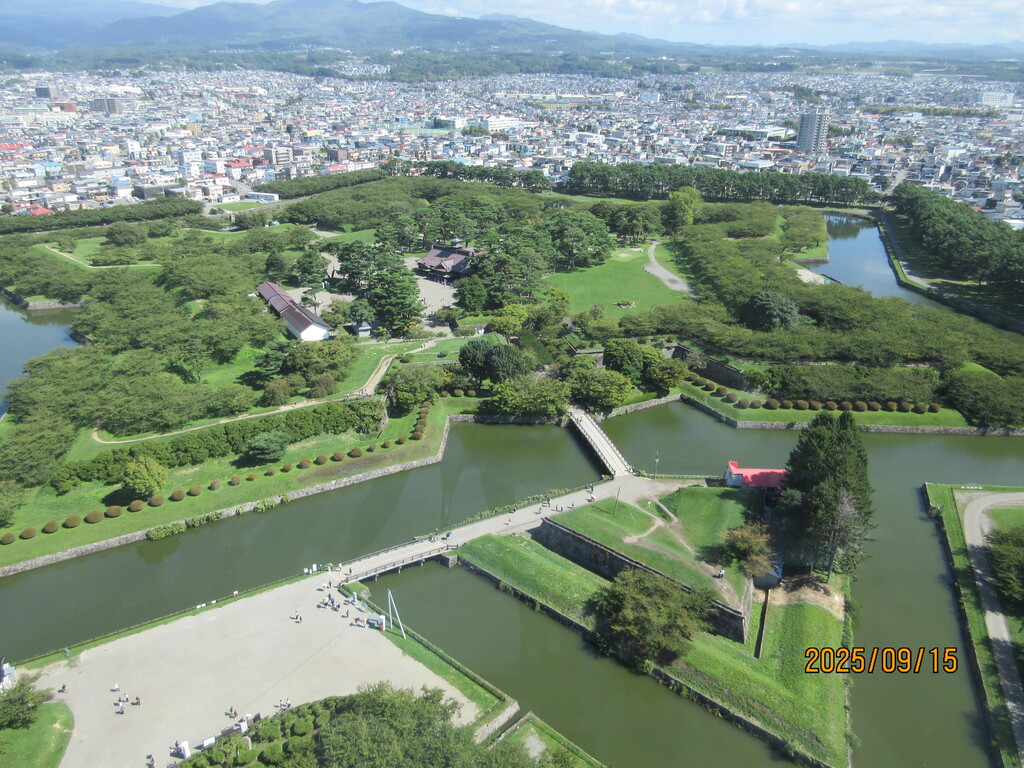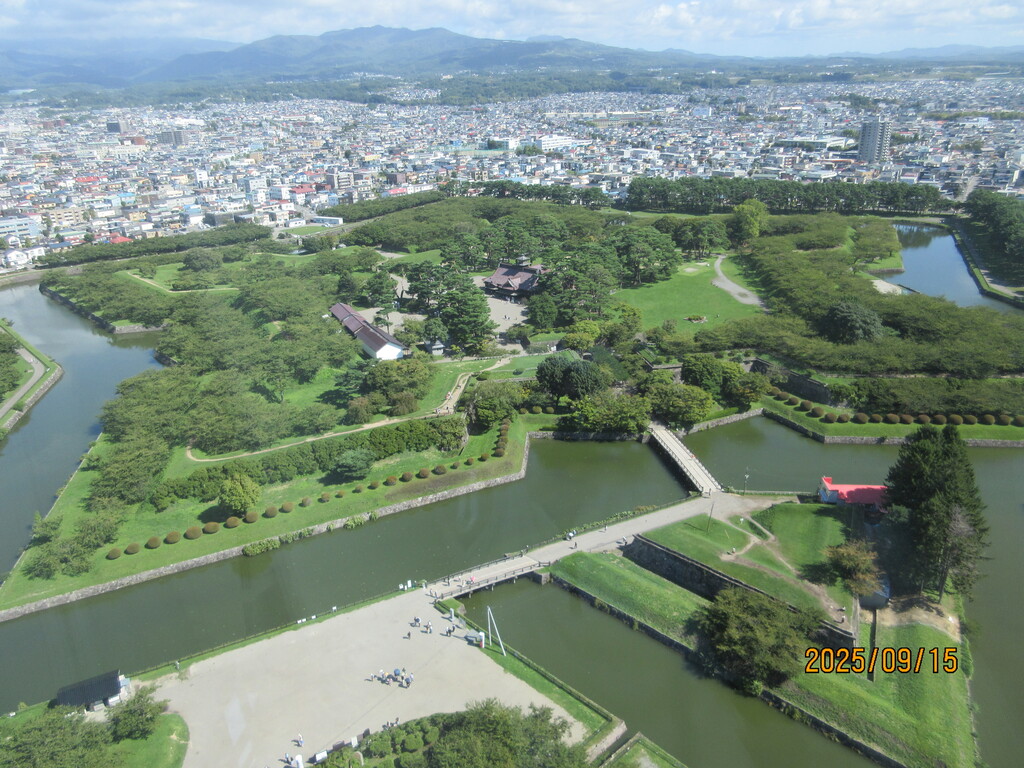 もう一度、五稜郭全体像。一周歩けば20分以上。1815mある堀の外側には遊歩道があります。一応反時計回りが原則で、自転車は減速して走ること。ランナーもいればウォーカーもいて、朝から走ったり歩いたり。駐車場はないので、美術館の有料駐車場を使用することです。