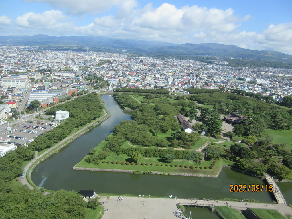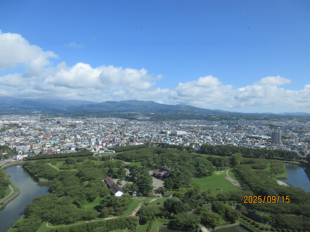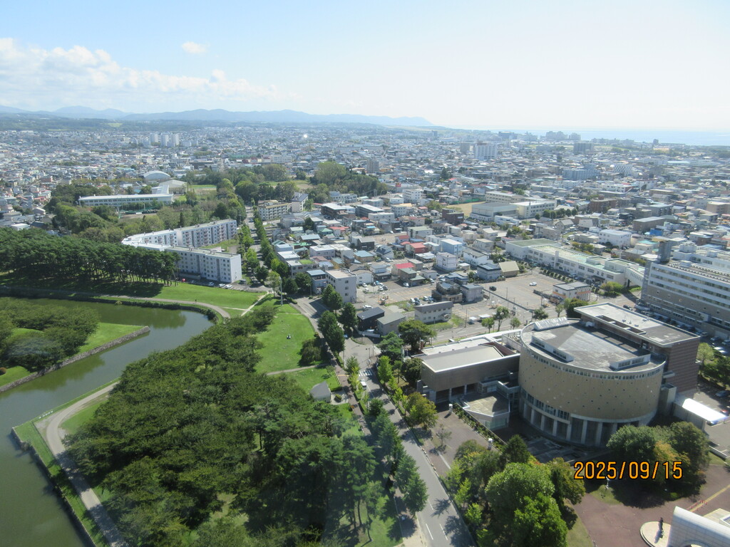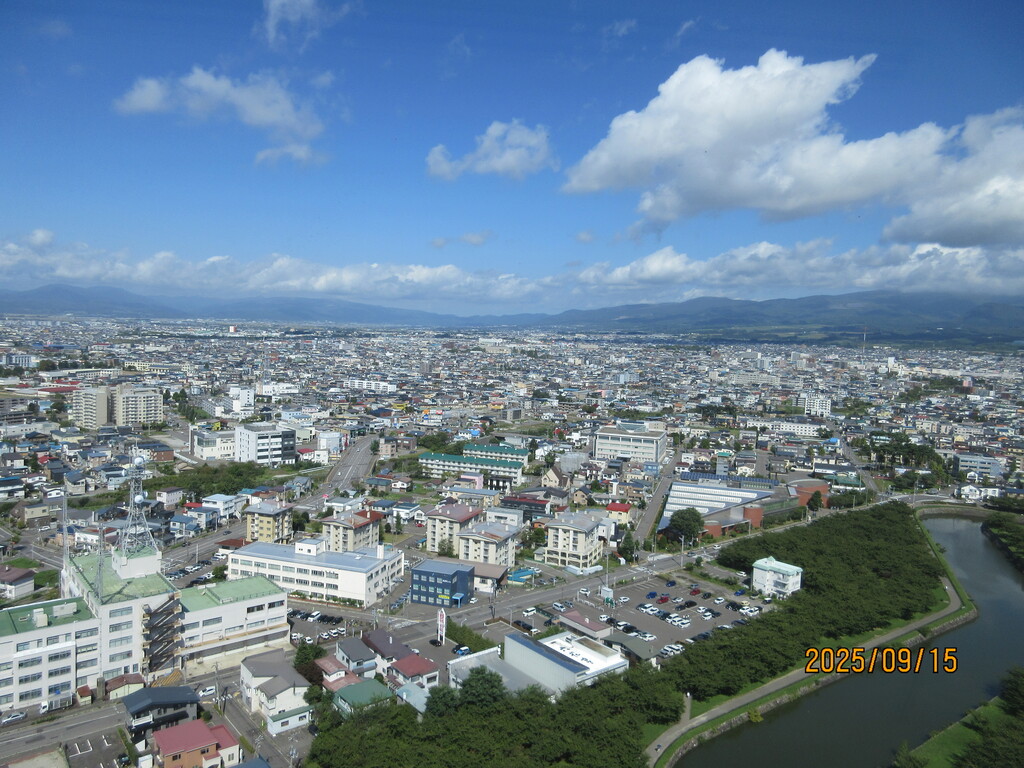 さて、今回と次回は先日65歳以上はご招待の五稜郭タワーへ行ってきましたので、さっそくお伝えしたいと思います。高さおよそ100mからの展望です。こちらは北東側で、住宅街がどんどん広がっているのは土地があるのと地価が安いからでしょう。交通の便はそれほど良くなく、やはり車がないと不便な地でもあります。