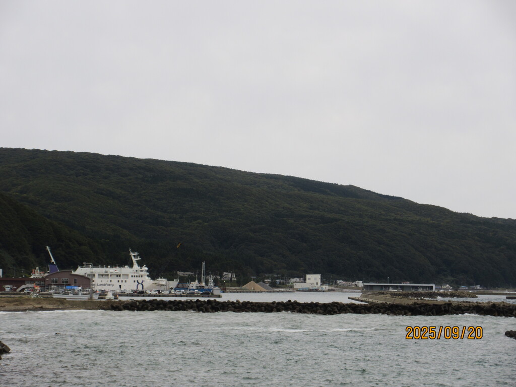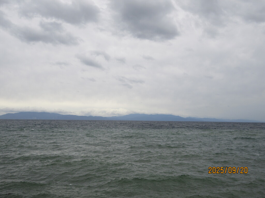 対岸の渡島半島せたな町大成区の山々には低く雲がかかっていて、天気が悪くなる予感がしますね。実はその通りで、この後は少しずつポツリ・ポツリと雨が降り出し、やがて大雨へ。夜間は風も強まり強風・豪雨へ。最初考えていたホテルや旅館・民宿に泊まれなければ車中泊でもするか?などと呑気なプランだったら、大変な目に遭っていたかも?