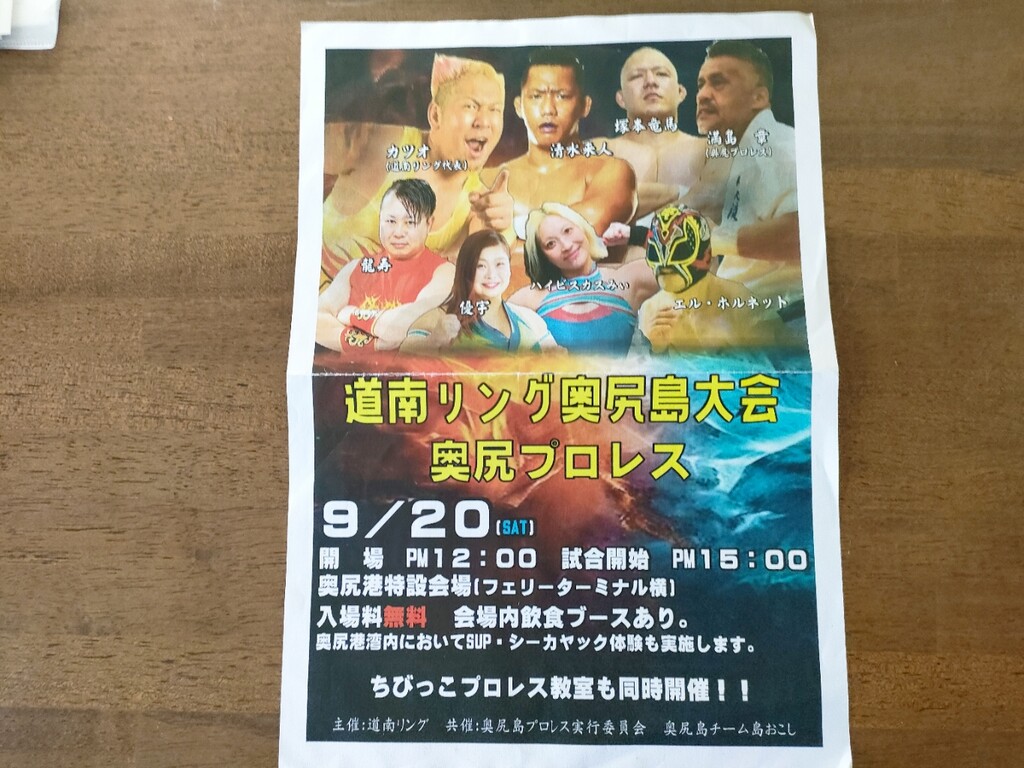 ここで選手の紹介。左上が今回の奥尻大会の主催をした道南リング代表であるカツオ選手、右上が奥尻町役場職員で空手選手でもある満島章選手、清水来人選手と塚本竜馬選手、マスクマンのエル・ホルネット選手は東京から。ハイビスカスみぃ選手は琉球プロレス所属、優宇選手は仙台女子プロレス所属、龍寿選手は唯一道内で札幌から参戦。皆さん、遠くから駆けつけて来ているのです。