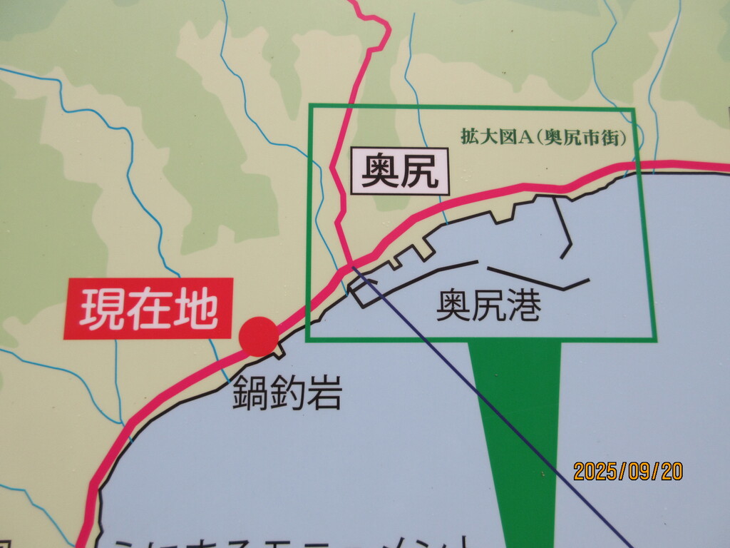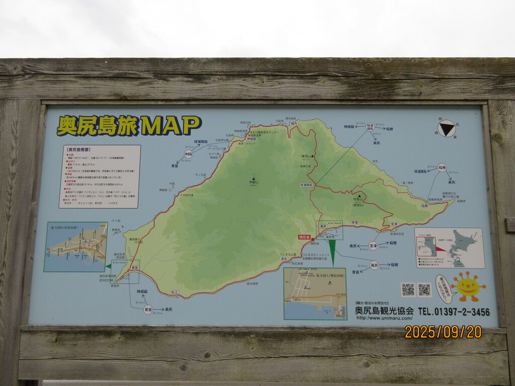 奥尻島の地図を見てみましょう。北が右端になっていて、島が横向き。下側が東海岸で、上が西海岸。人口(2000人ほど)のほとんどは東側。現在地は赤いポイントで、青の矢印がフェリー乗り場。拡大図を見てみます。