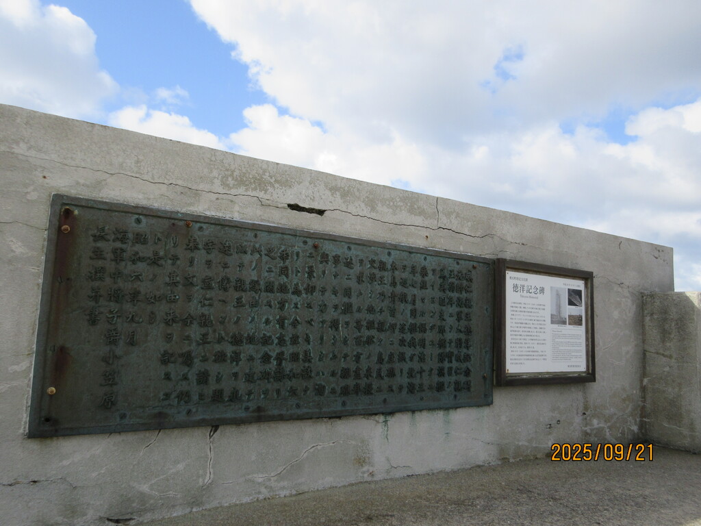 徳洋記念碑なるもので、1880年(明治13年)に青苗岬沖でイギリス海軍の軍艦が座礁、乗船していた皇室の方と島の人々が救助活動をして美徳をたたえた石碑です。高さは17mもあるもの。