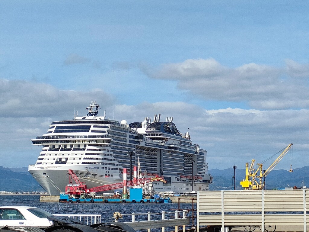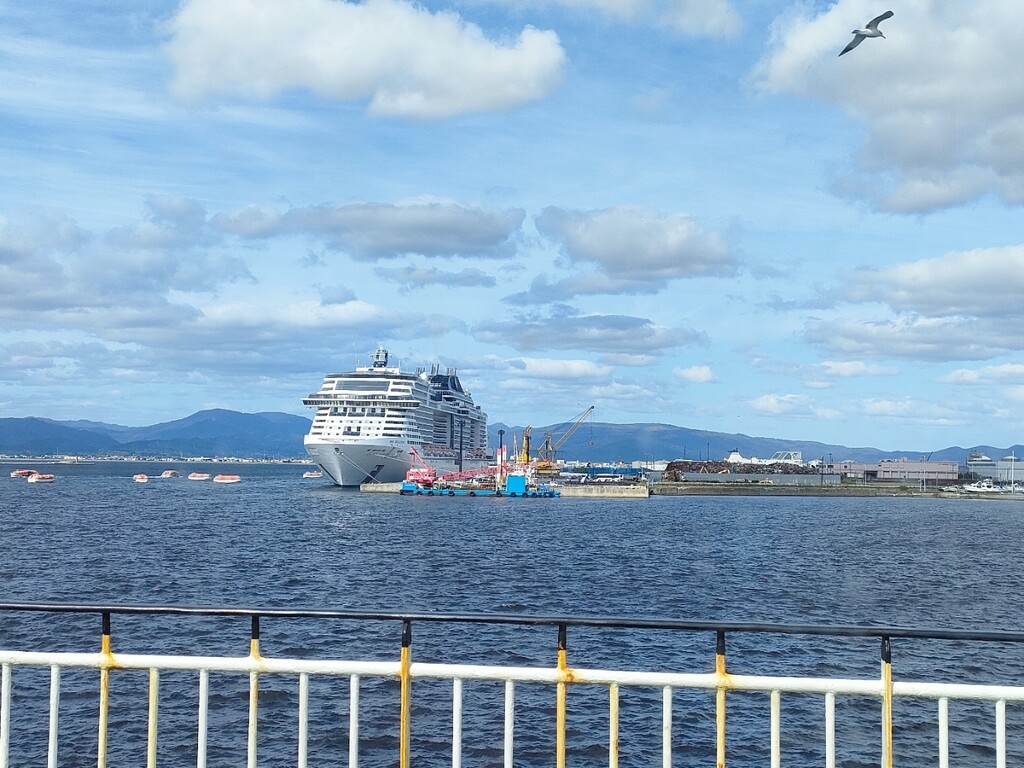 向かい側に、超大型クルーズ船が停泊中。外国から来た船ではなかろうか?一体どんな富裕層の人が乗っているのか?