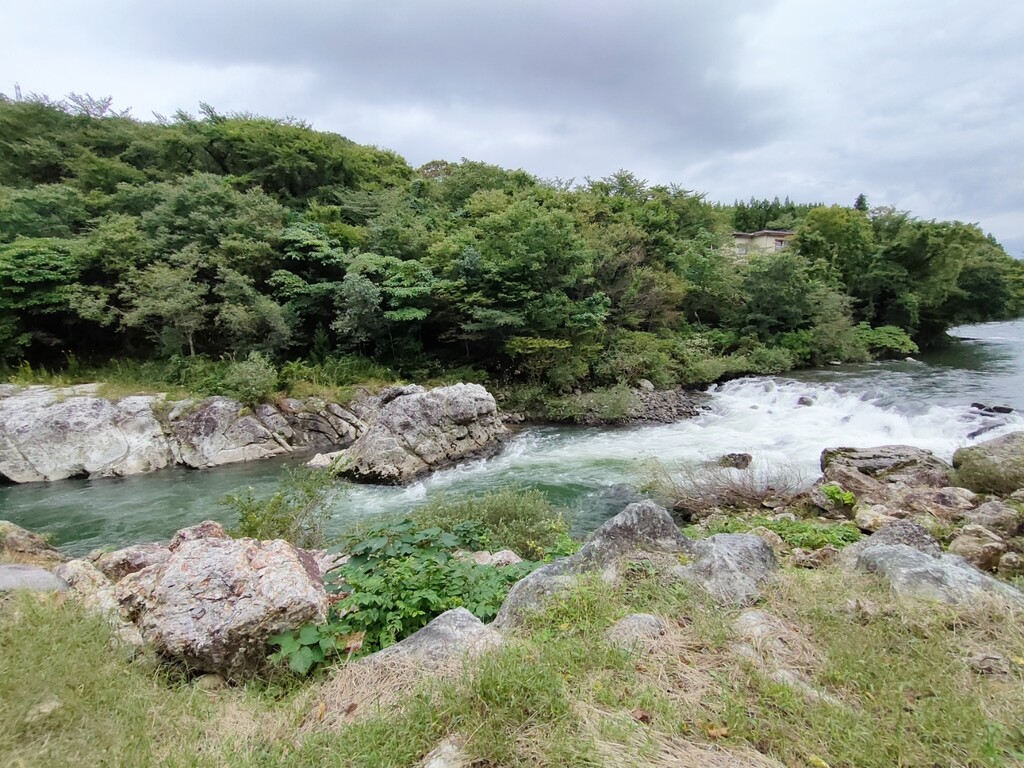 右に見える赤い橋が氾濫後に建設された新しい橋で、左の三角の屋根が道の駅。