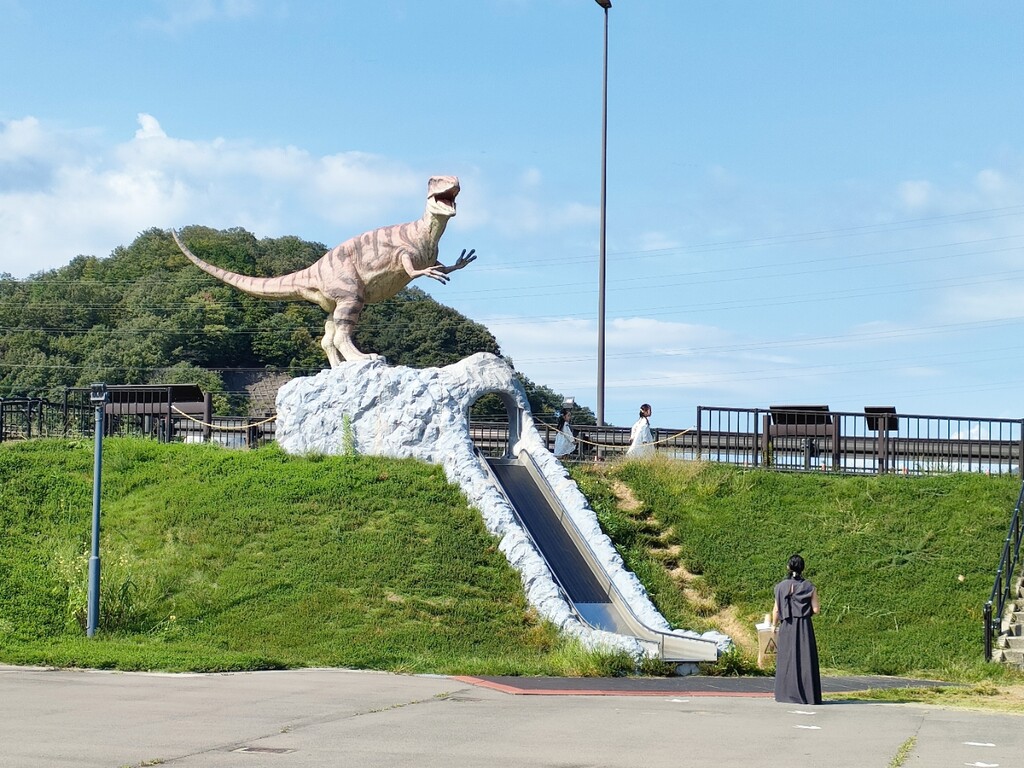 滑り台の上に恐竜。