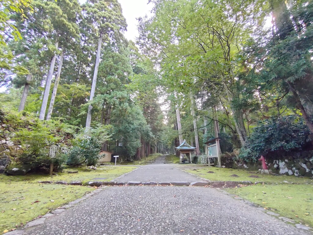 朝7時前に到着。長ーい参道を歩いて行きますが、杉の巨木が茂る厳粛な雰囲気の地に圧倒されます。